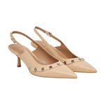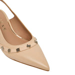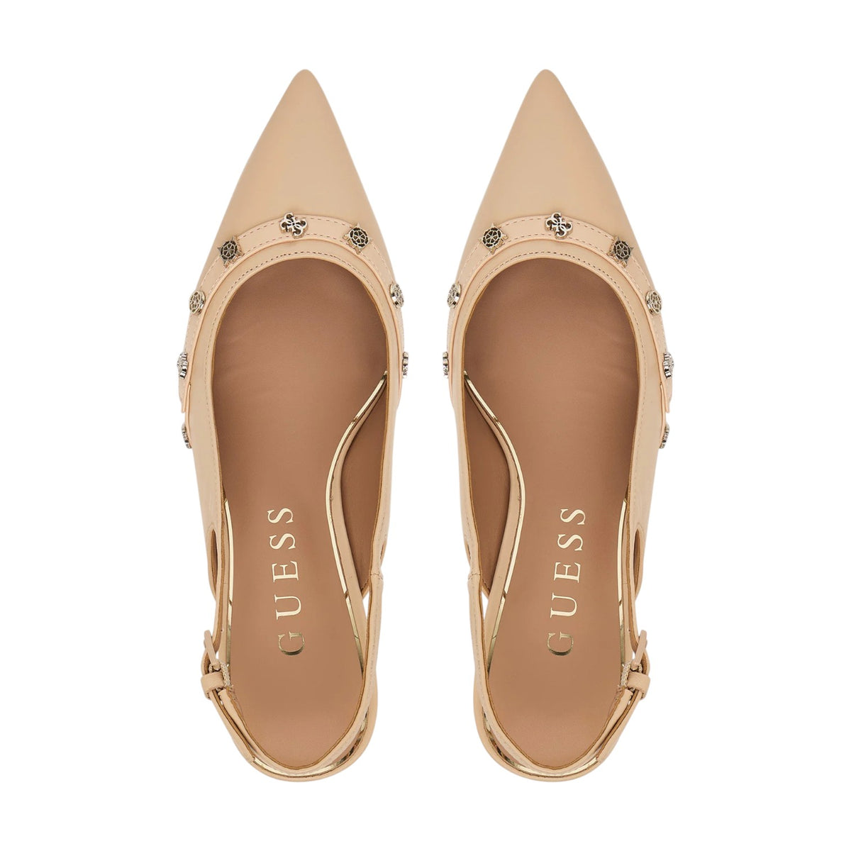 La Chanelle firmata Guess, realizzata in pelle qui proposta nella variante nudo è caratterizzata da dettagli accessori 4G peony in metallo e da un comodo cinturino regolabile, presenta un comodo plantare in pelle e tacchetto alto 7cm.