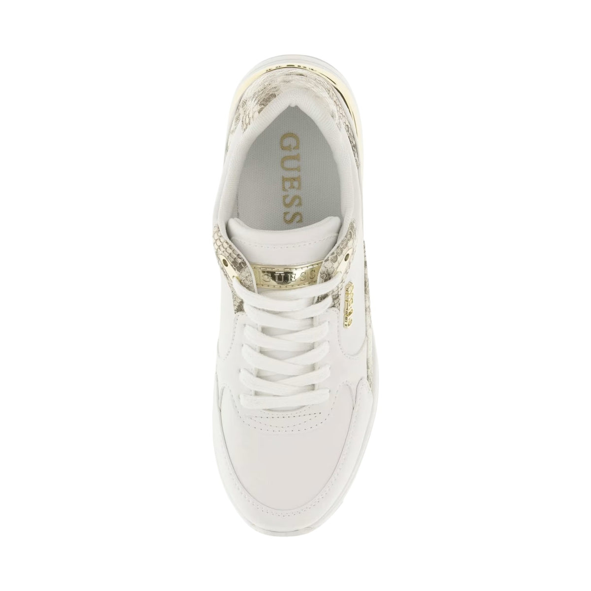 La Sneakers firmata Guess, realizzata in ecopelle è caratterizzata da stampa animalier e inserti laminati dorati, e scritta logo frontale, laterale, sul retro e suola. Inoltre presenta un sottopiede estraibile e fodera rivestiti in tessuto. Dal design d'ispirazione sportiva, un modello che slancia la figura, offrendo benessere tutto il giorno, ideale in citta o per il tempo libero.