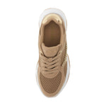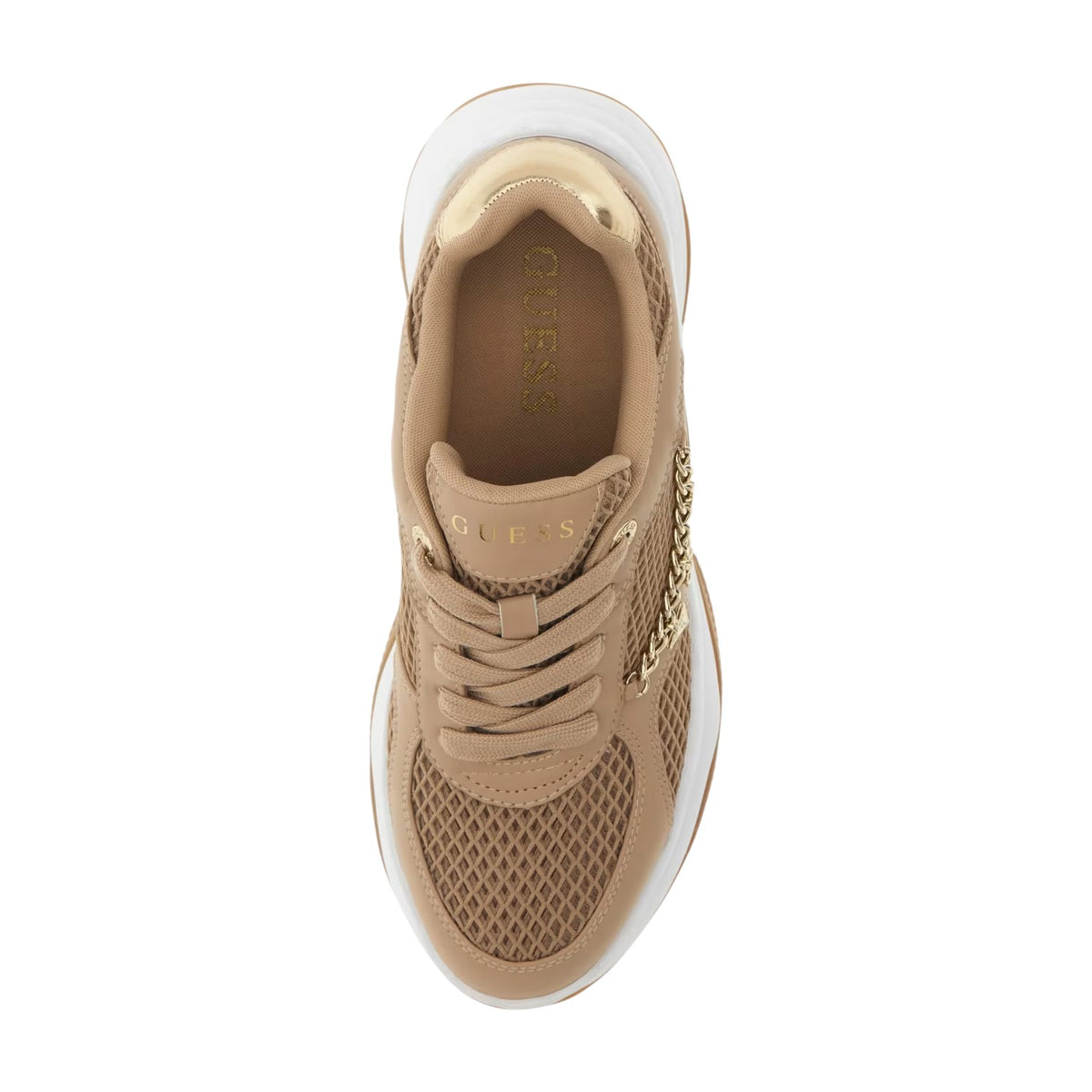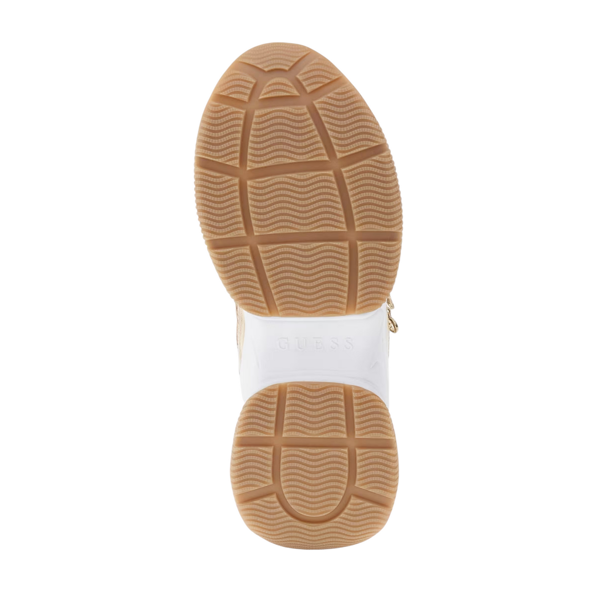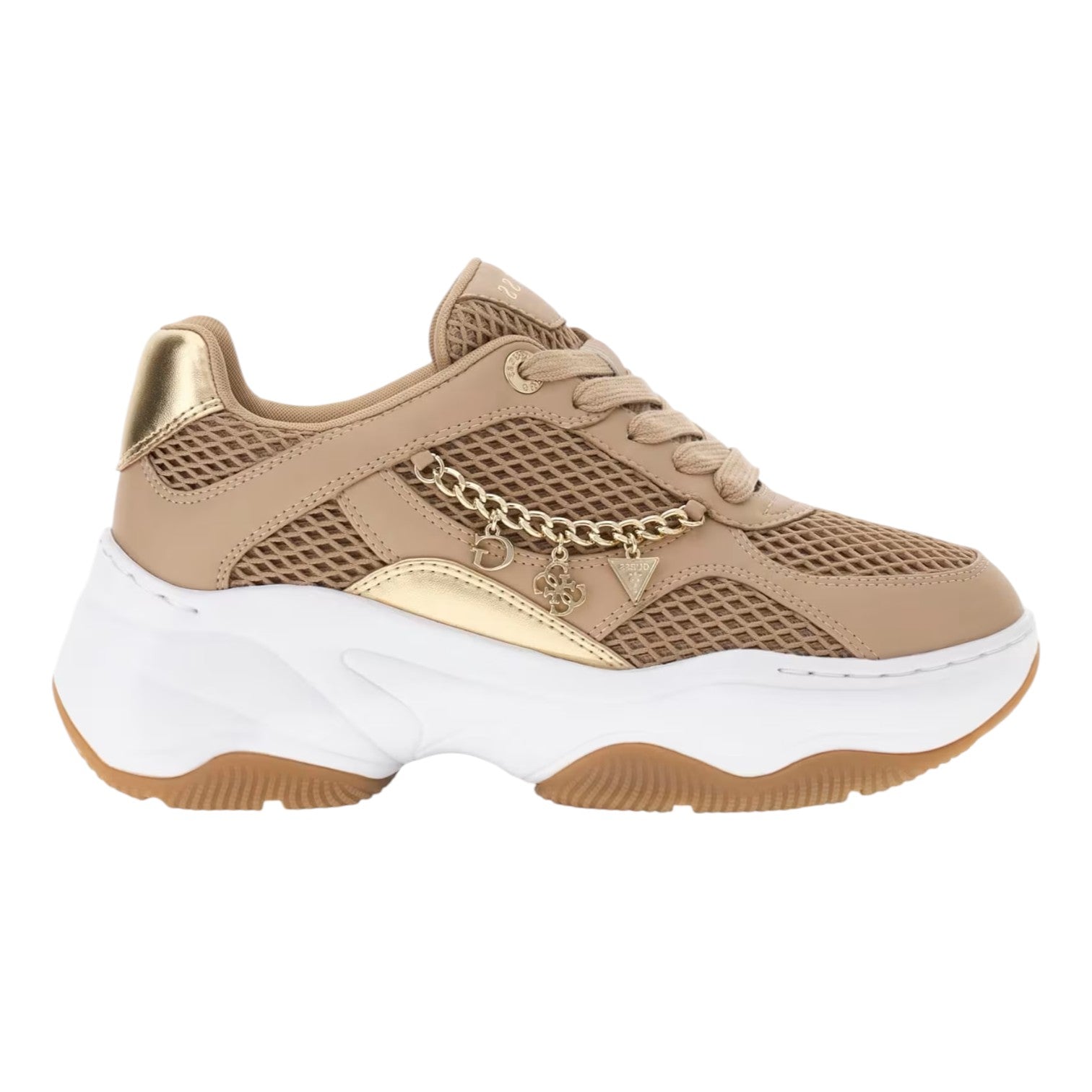 La Sneakers firmata Guess, realizzata in ecopelle e tessuto nella variante avena dispone di inserto laminato e catena con ciondoli logo. Modello accompagnato dalla suola con plateau, lussuose e comode, per un look di tendenza con un tocco di femminilità.