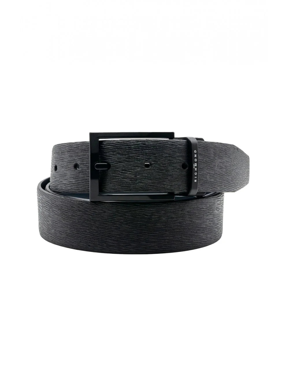 La Cintura firmata John Richmond, realizzata in saffiano è caratterizzata da scritta bianca logata sul passante e da fibbia nera opaca modello double face.