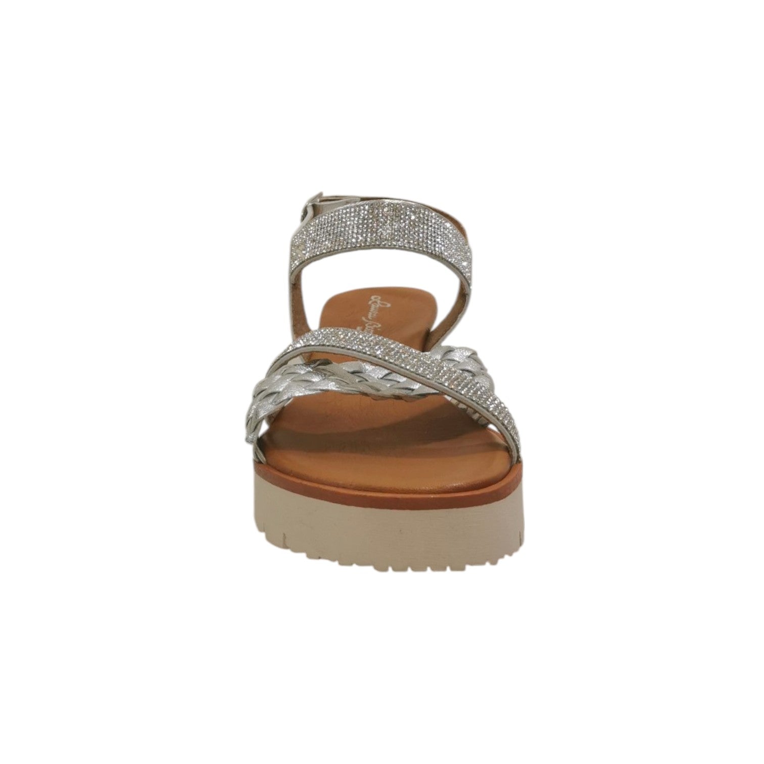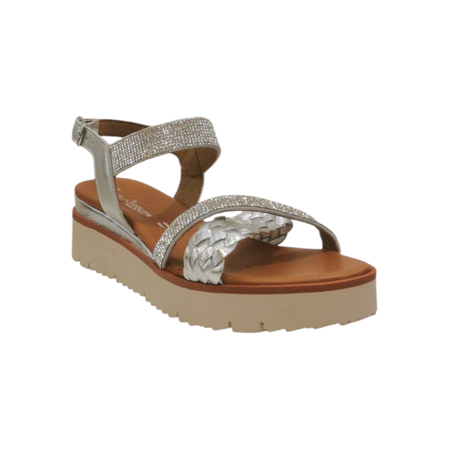 Il Sandalo firmato Laura Bizzarri, realizzato in vera pelle 'Made in Italy' è caratterizzato da fascia intrecciata e fasce con applicati degli strass, presenta una comoda zeppa di 5cm che slancia la figura e da morbido sottopiede in pelle per un maggior comfort.