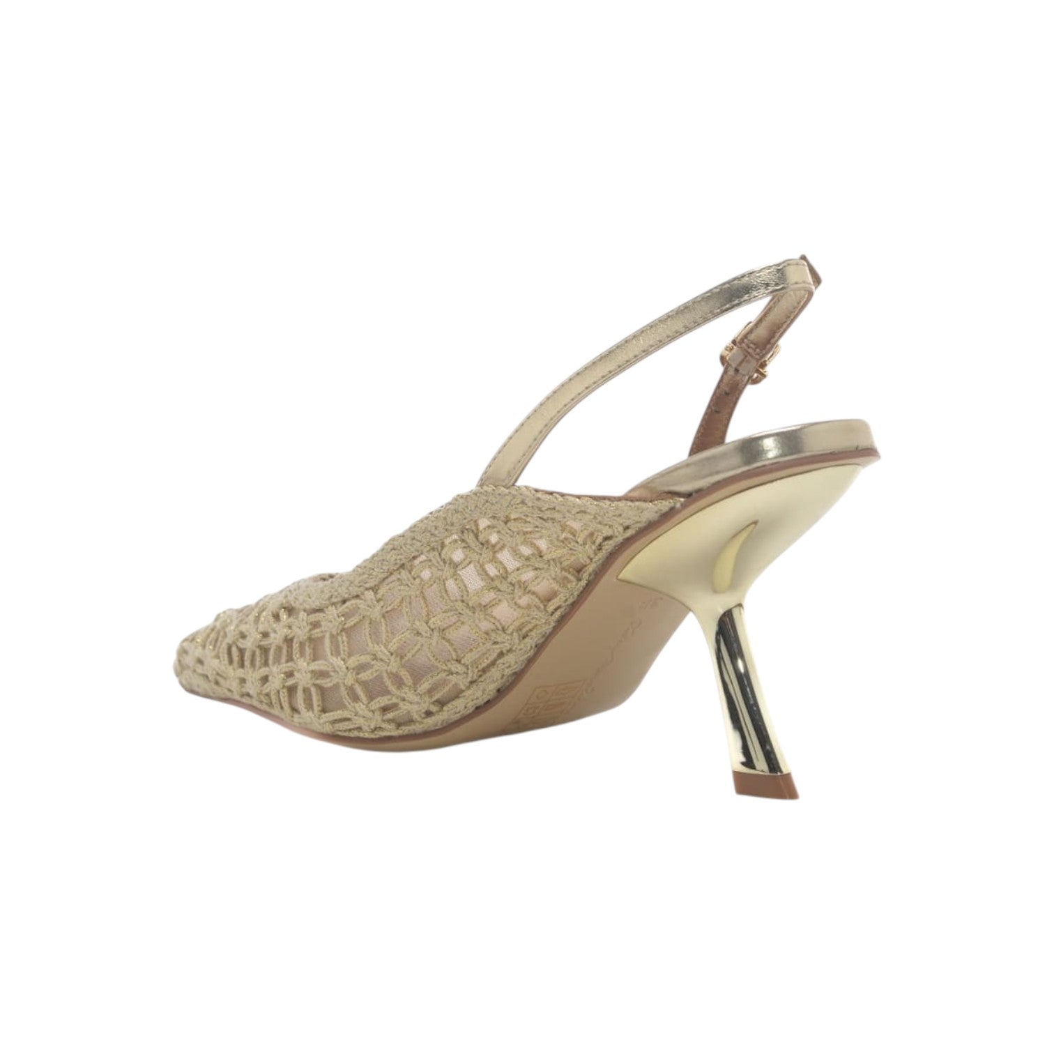 La Chanelle firmata Luciano Barachini, realizzato in tessuto intrecciato qui proposta nella variante platino è caratterizzata da dettaglio con rete e da una chiusura con fibbia regolabile e tacco scultoreo alto 9cm. Il plantare interno in pelle garantisce un comfort superiore durante l'intera giornata, avvolgendo il piede in morbidezza e stabilità.