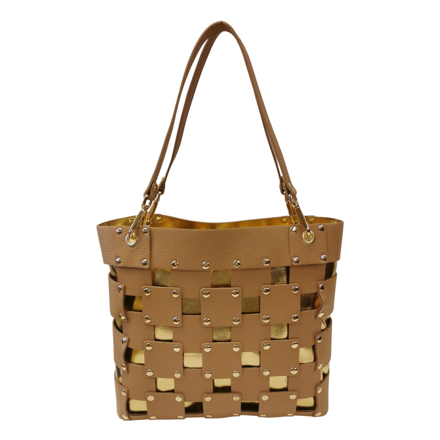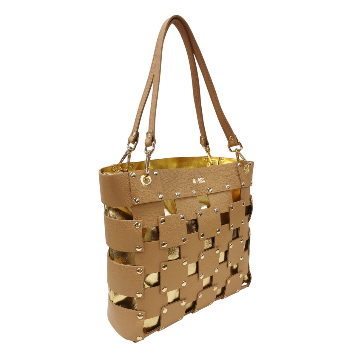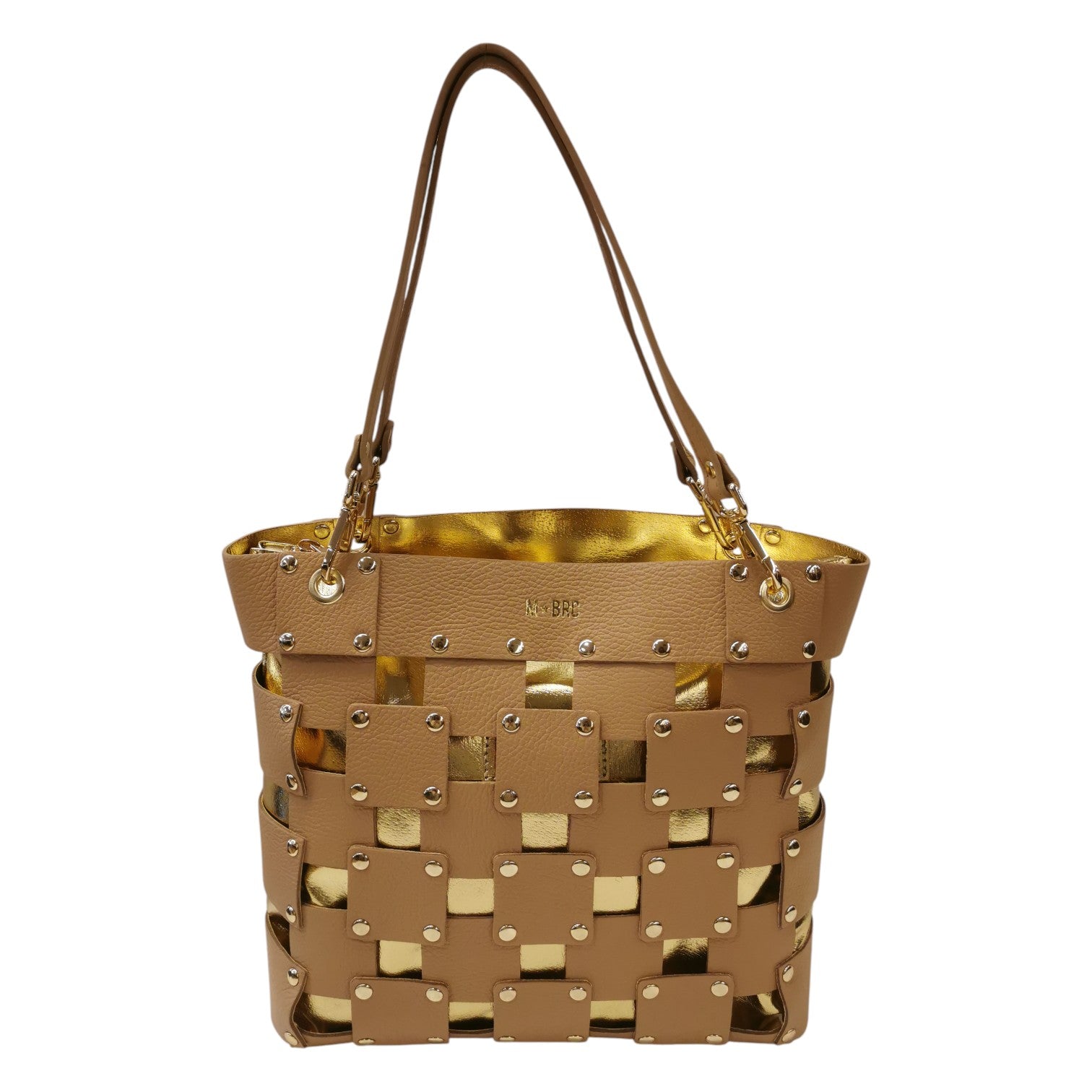 La Borsa a spalla firmata M Brc, della Linea Square realizzata in pelle cammello presenta una sofisticata trama traforata squadrata arricchita da borchiette dorate che catturano lo sguardo. I manici removibili offrono massima flessibilità d'uso, permettendoti di trasformare lo stile secondo l'occasione. L'interno completamente rivestito in pelle garantisce durabilità e protezione, mentre la pochette grande in pelle removibile ti consente di organizzare gli spazi con eleganza.