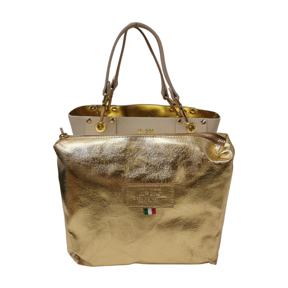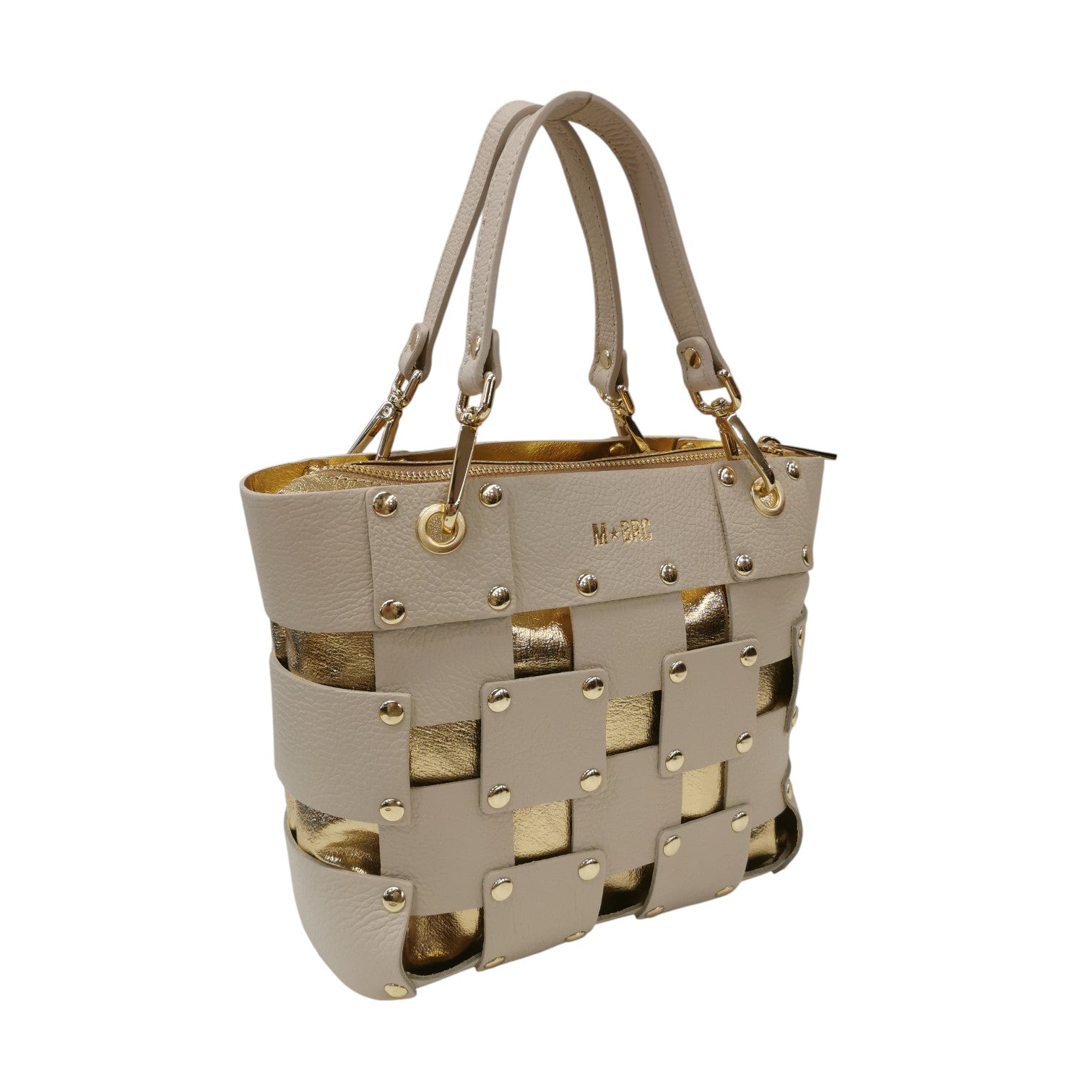 La Borsa a spalla firmata M Brc, della Linea Square realizzata in pelle avorio presenta una sofisticata trama traforata squadrata arricchita da borchiette dorate che catturano lo sguardo. I manici removibili offrono massima flessibilità d'uso, permettendoti di trasformare lo stile secondo l'occasione. L'interno completamente rivestito in pelle garantisce durabilità e protezione, mentre la pochette grande in pelle removibile ti consente di organizzare gli spazi con eleganza.