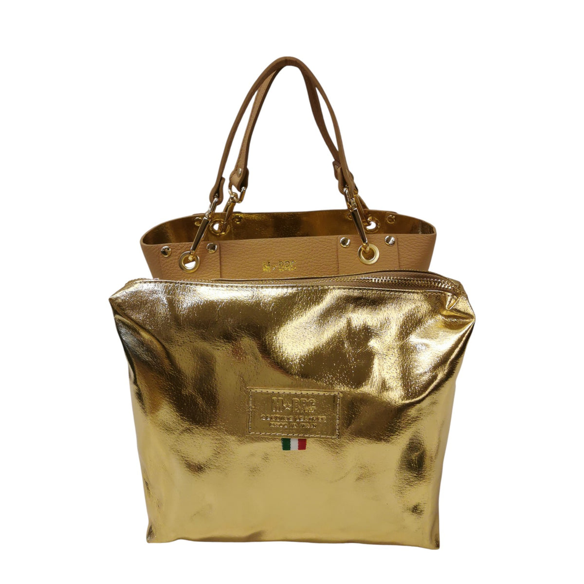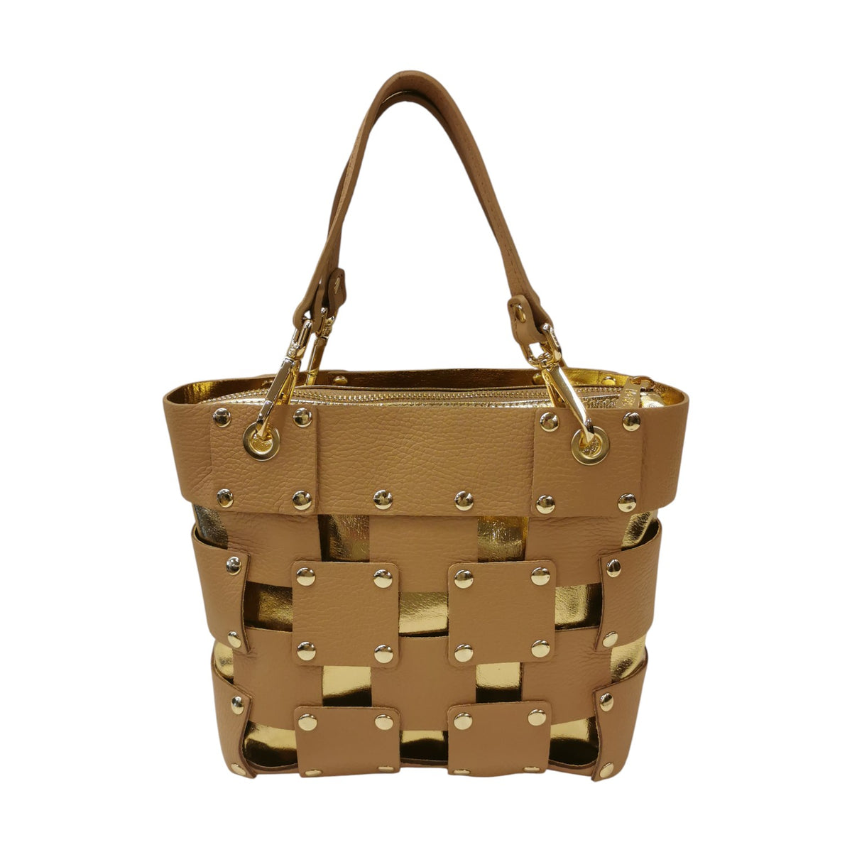 La Borsa a spalla firmata M Brc, della Linea Square realizzata in pelle cammello presenta una sofisticata trama traforata squadrata arricchita da borchiette dorate che catturano lo sguardo. I manici removibili offrono massima flessibilità d'uso, permettendoti di trasformare lo stile secondo l'occasione. L'interno completamente rivestito in pelle garantisce durabilità e protezione, mentre la pochette grande in pelle removibile ti consente di organizzare gli spazi con eleganza.