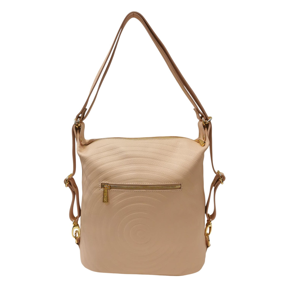 La Borsa a spalla firmata M Brc, della Linea Round può essere indossata sia a tracolla che come zaino. Realizzata in pelle cipria di alta qualità, unisce eleganza e praticità grazie alla chiusura con cerniera, alla tasca interna chiusa con zip. Le finiture con placcatura in oro aggiungono un tocco di lusso discreto, rendendola perfetta per ogni occasione, dal lavoro al tempo libero.