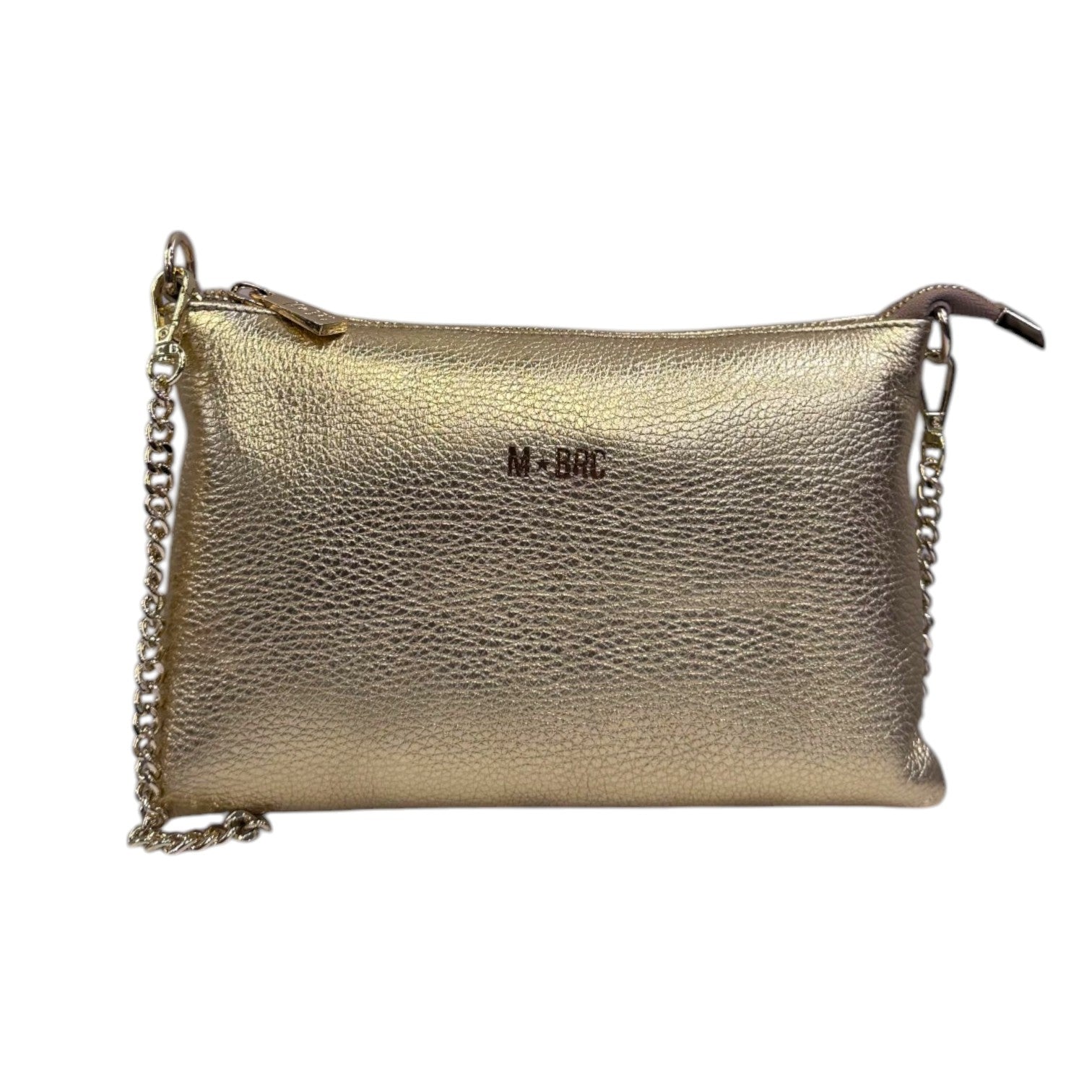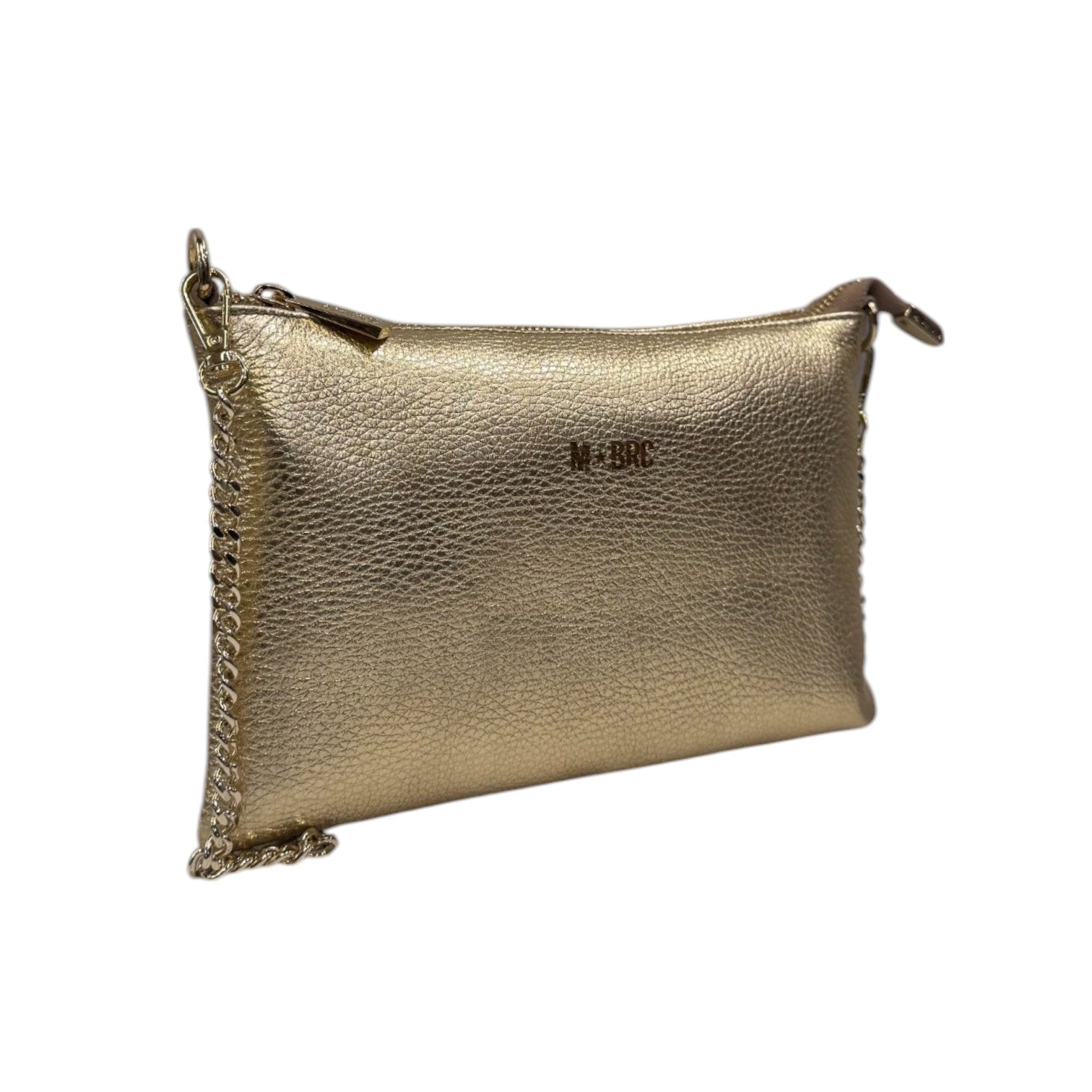 La Pochette firmata M Brc, della Linea Jolly realizzata in vera pelle è caratterizzata da tracolla a catena dorata removibile e da polsino removibile, presenta una chiusura con zip, dispone all'interno di taschino con zip.