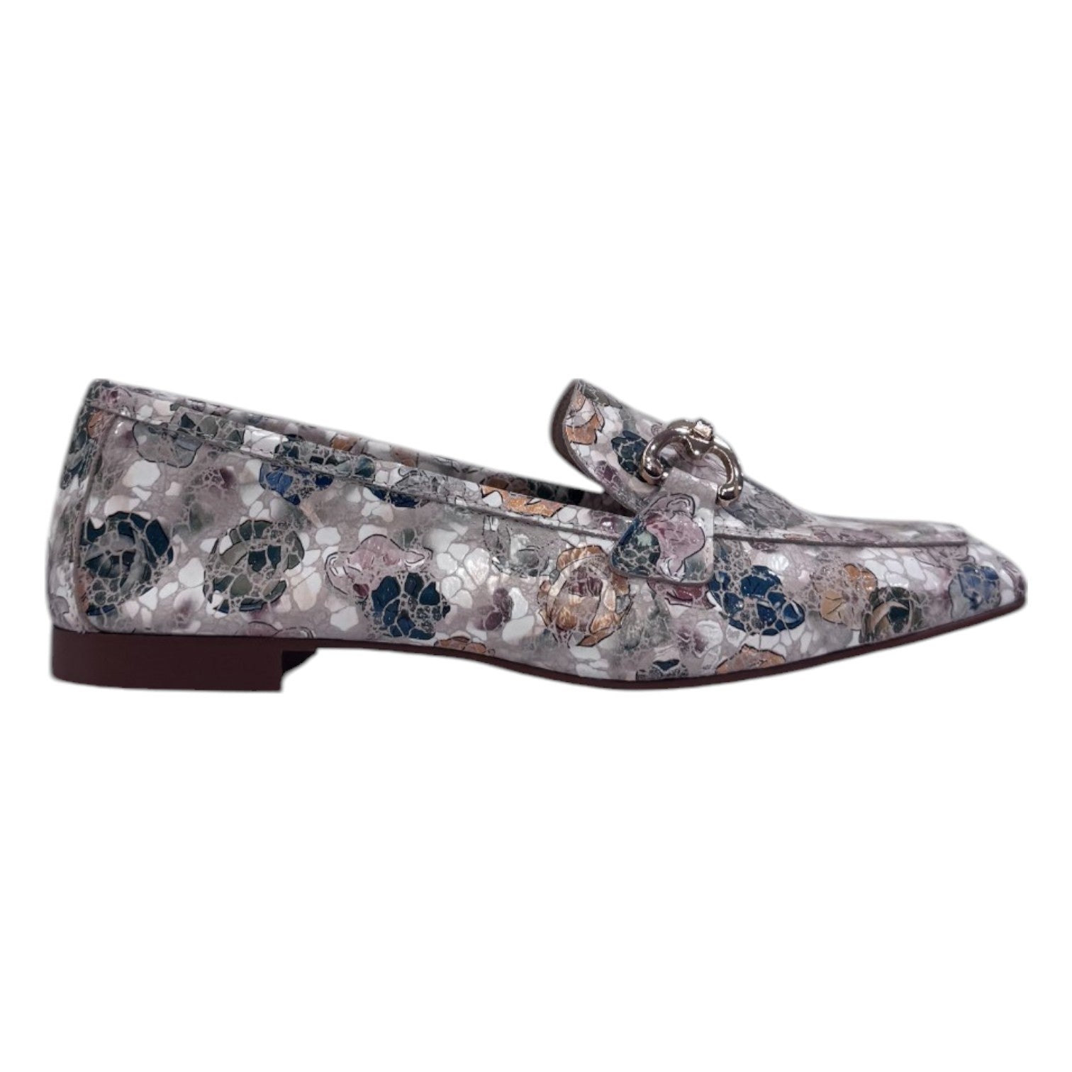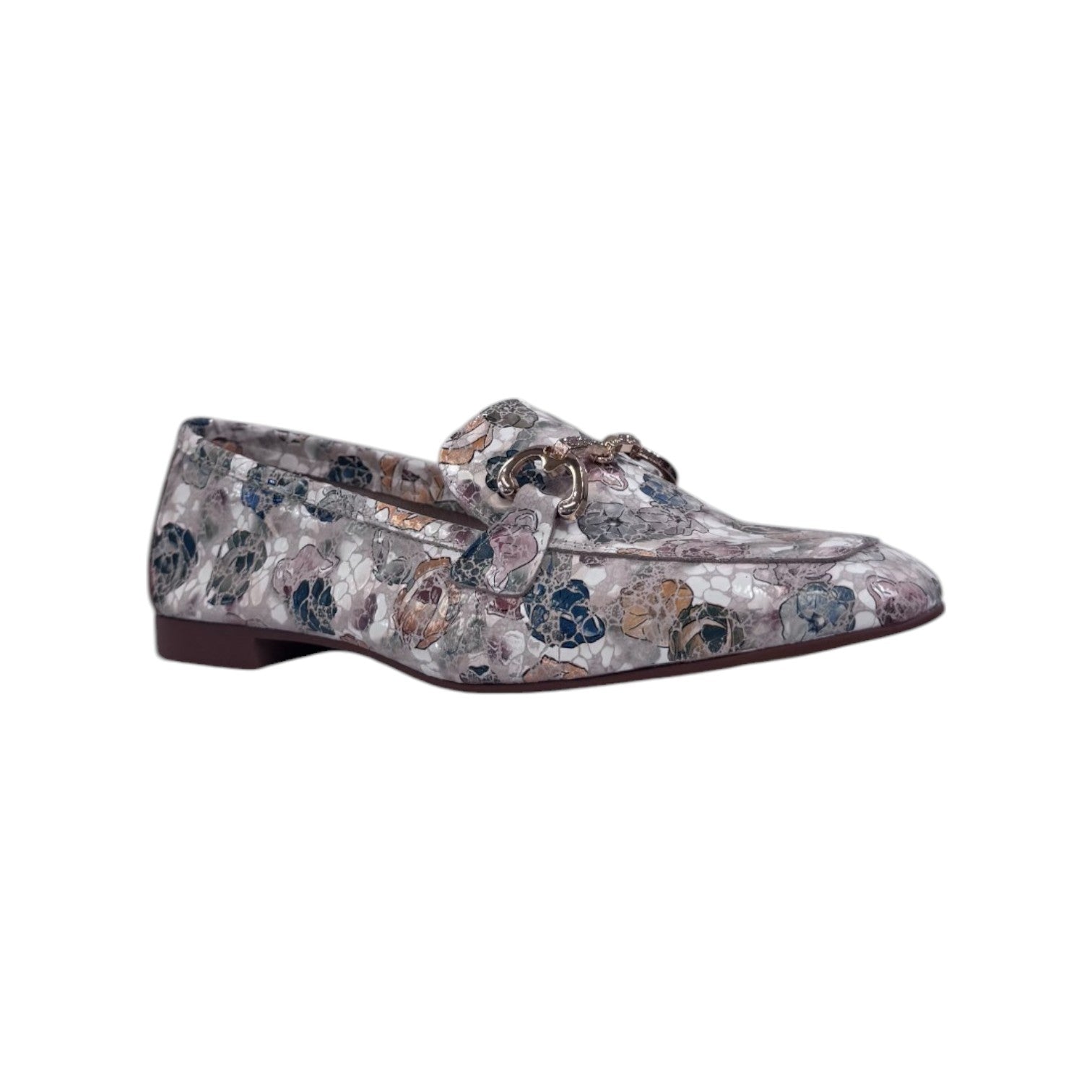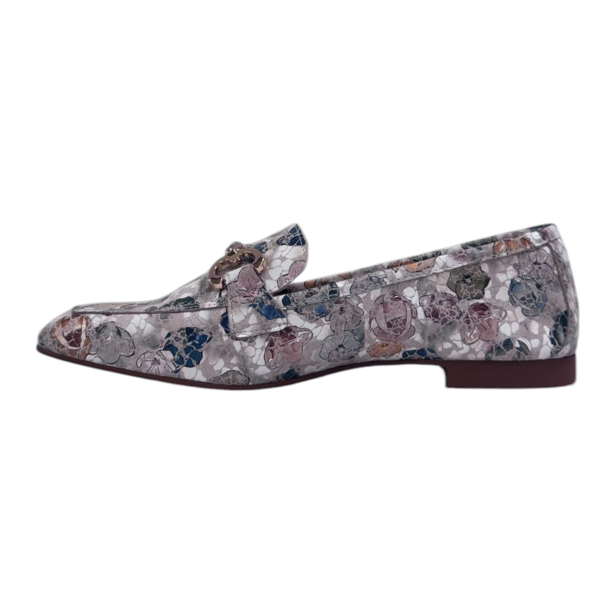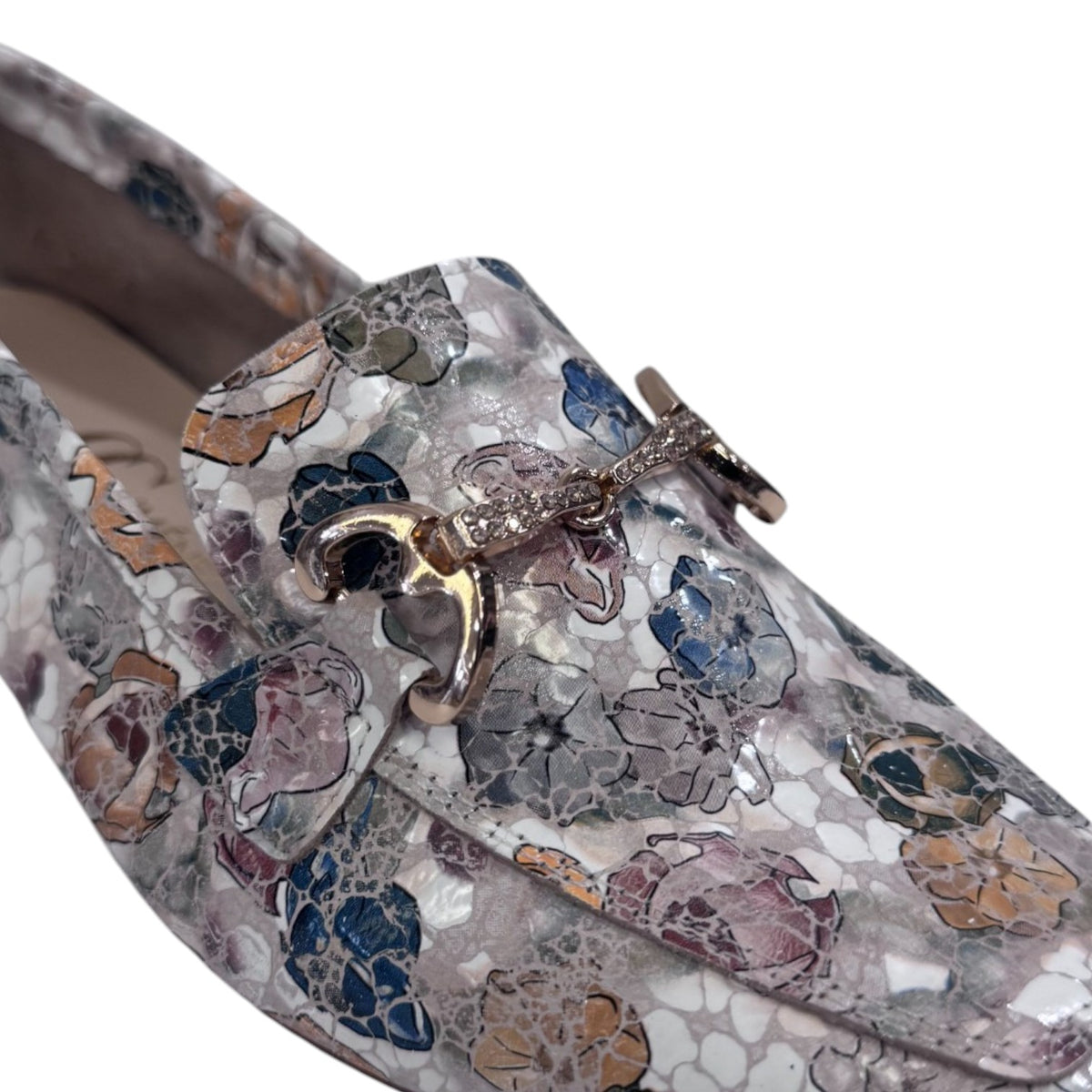 Il Mocassino firmato Cayetano Giménez, realizzato in pelle è caratterizzato da morsetto frontale dorato con applicazione di mini strass e da una stampa floreale all over, la suola è molto leggera e flessibile, ha un tacchetto di 1cm con fondo in gomma. Modello pratico e leggero per l'uso di tutti i giorni.