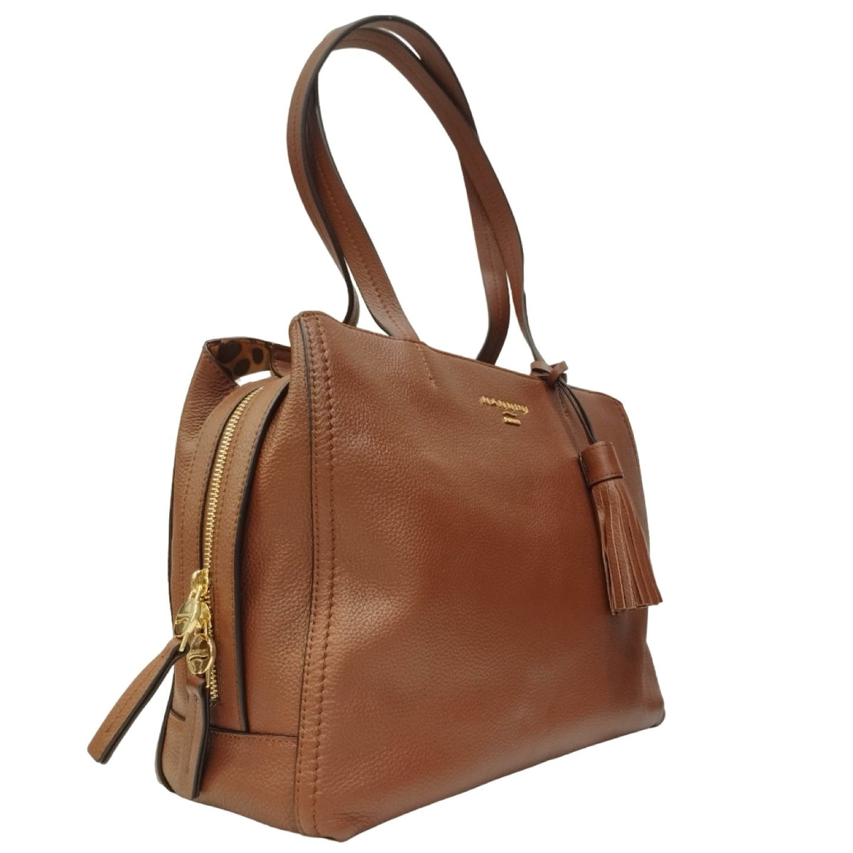 La Shopping Bag firmata Nannini Firenze, realizzata in pelle un accessorio adatto a qualsiasi occasione presenta un ciondolo con frange removibile ed l'interno foderato in tessuto stampa animalier, con 1 scomparto con tasche porta oggetti di cui 1 tasca con zip.