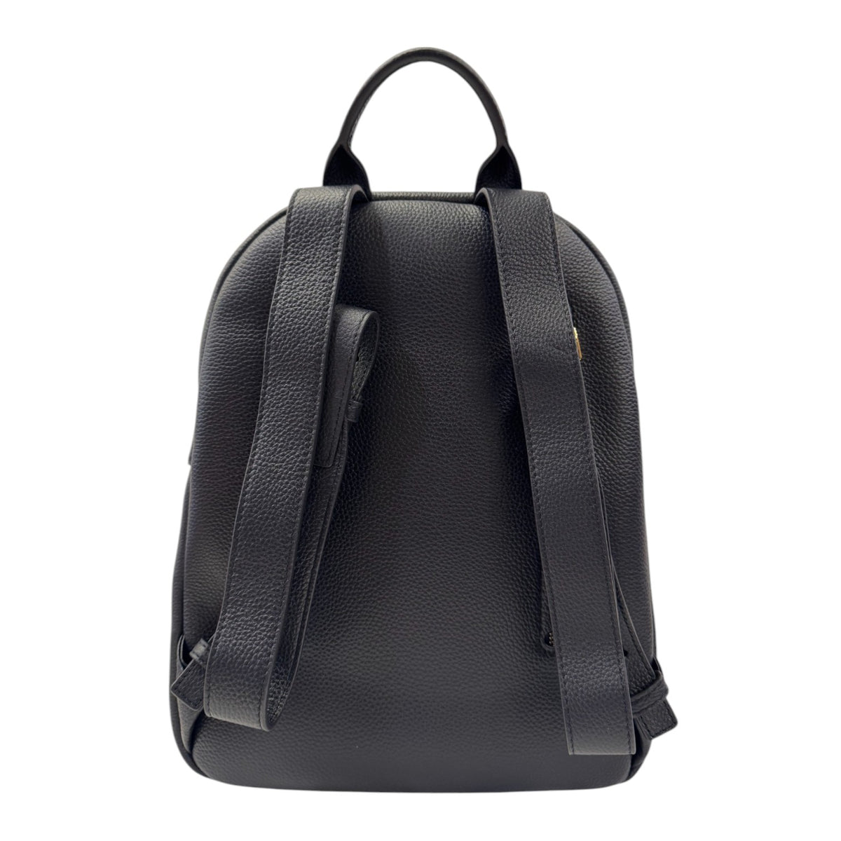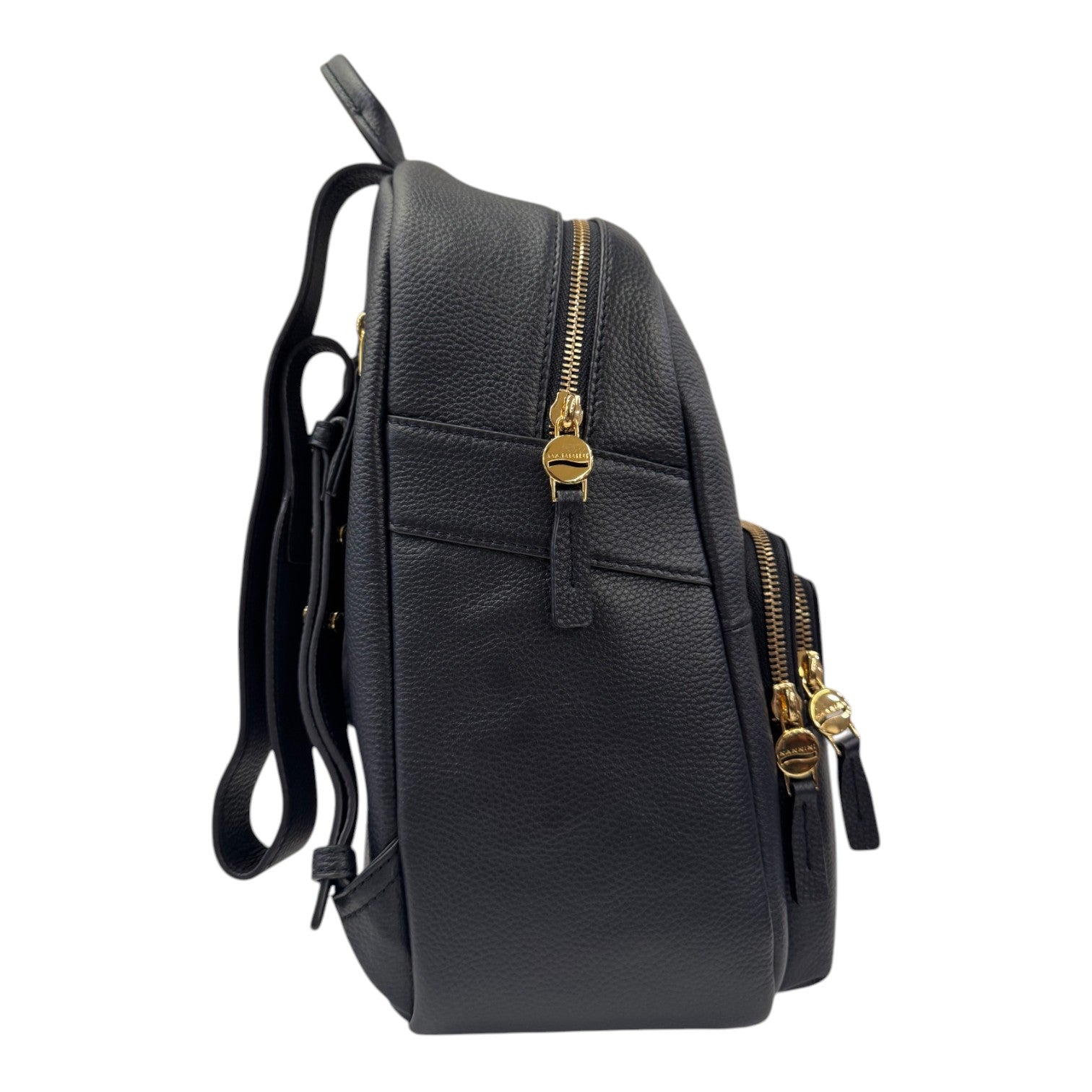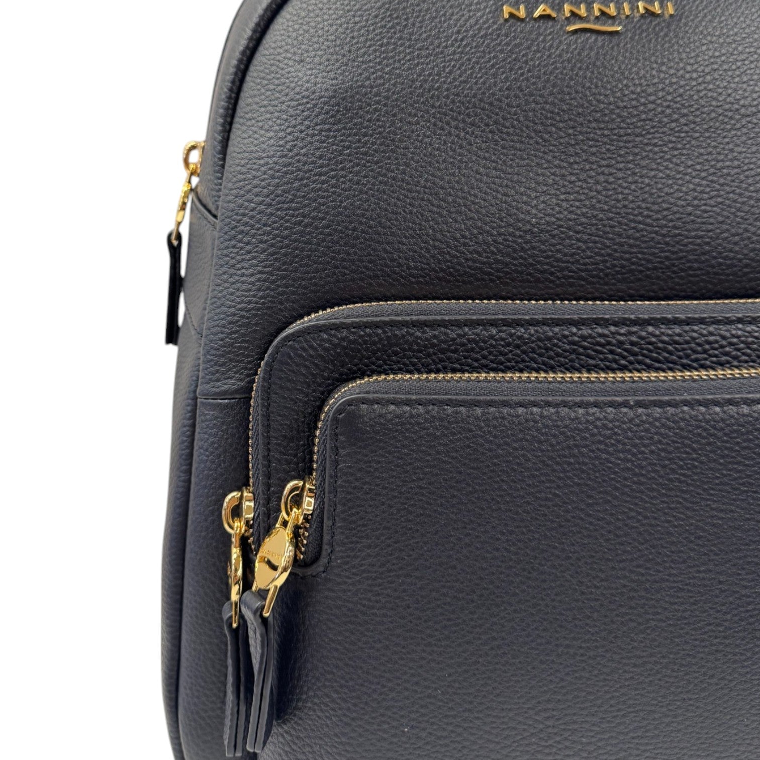 Lo Zaino firmato Nannini Firenze, realizzato in pelle è caratterizzato da tasche chiuse con zip frontali e da spallacci regolabili, l'interno è foderato in tessuto e dispone di un taschino chiuso con zip e due aperti, con taschino chiuso con zip sul retro.