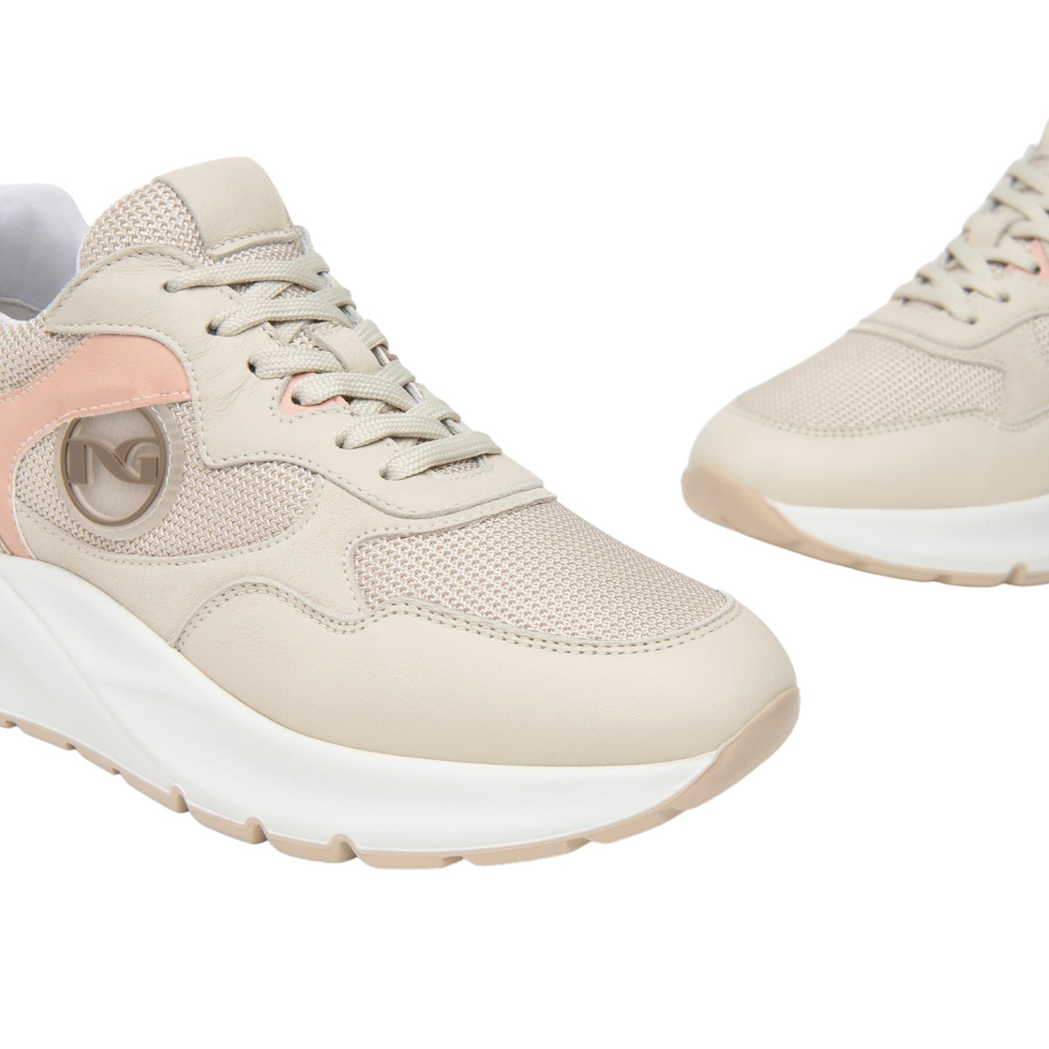 La Sneakers firmata Nero Giardini, realizzata in pelle beige è caratterizzata da inserto posteriore a contrasto di colore e da dettagli logati. Dispone di fodera interna rivestita in pelle e tessuto con comoda zeppa alta 4,5cm.