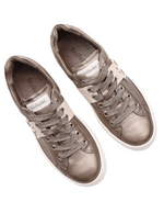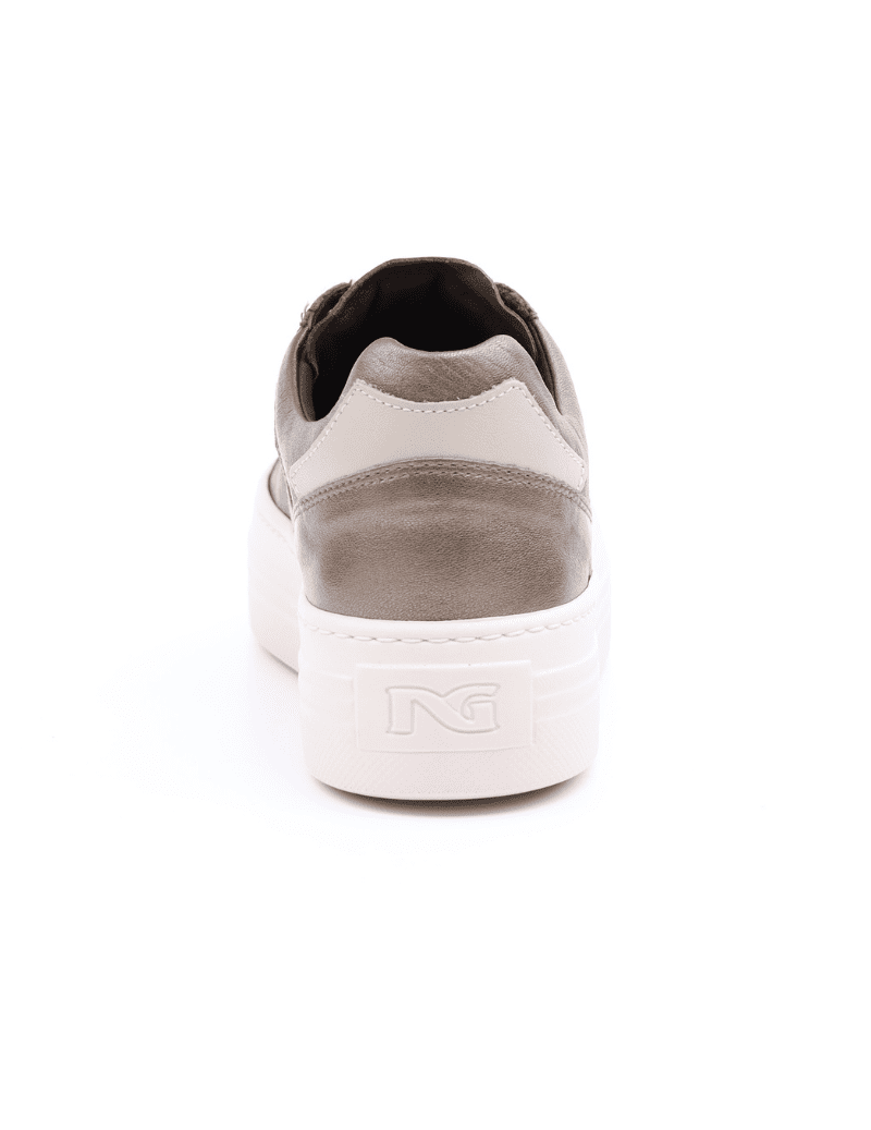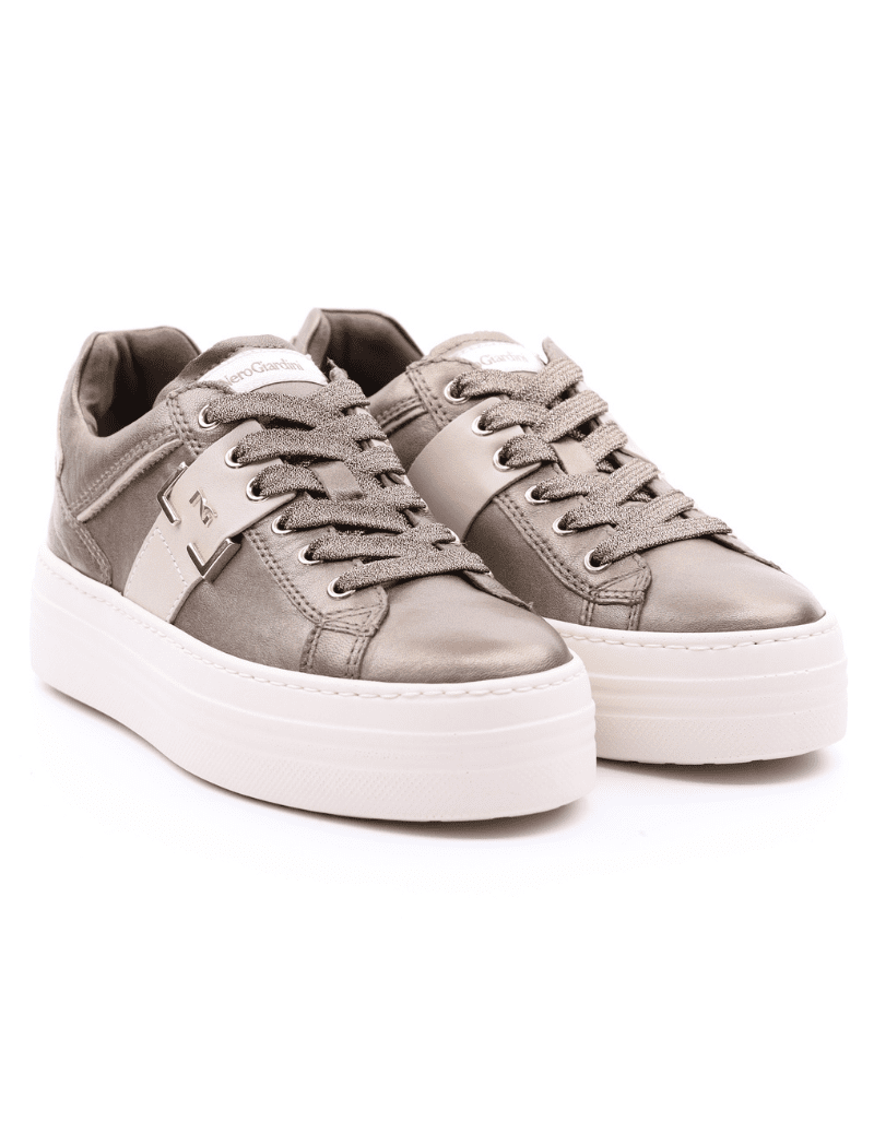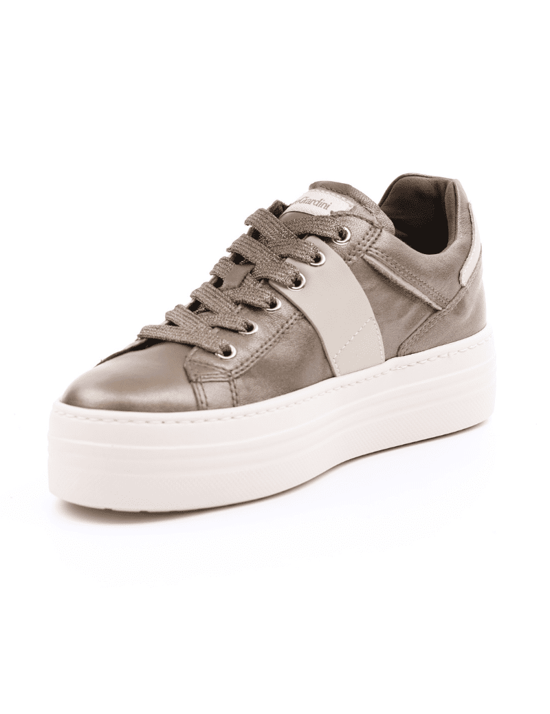 La Sneakers firmata Nero Giardini, realizzata in pelle laminata è caratterizzata da fasce laterali beige, con interno in pelle e come chiusura lacci in cotone luminoso bronzo. Presenta una suola in gomma extralight bianca alta 4cm.