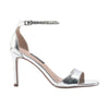 Il Sandalo firmato Nine West, realizzato in similpelle laminata argentata presenta un cinturino alla caviglia con mini diamantini.