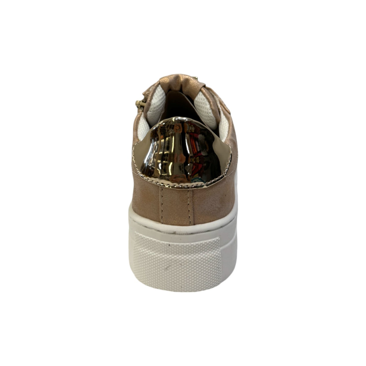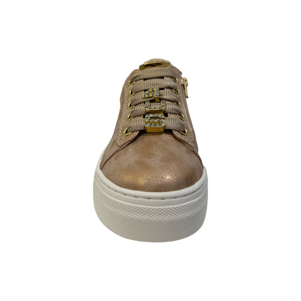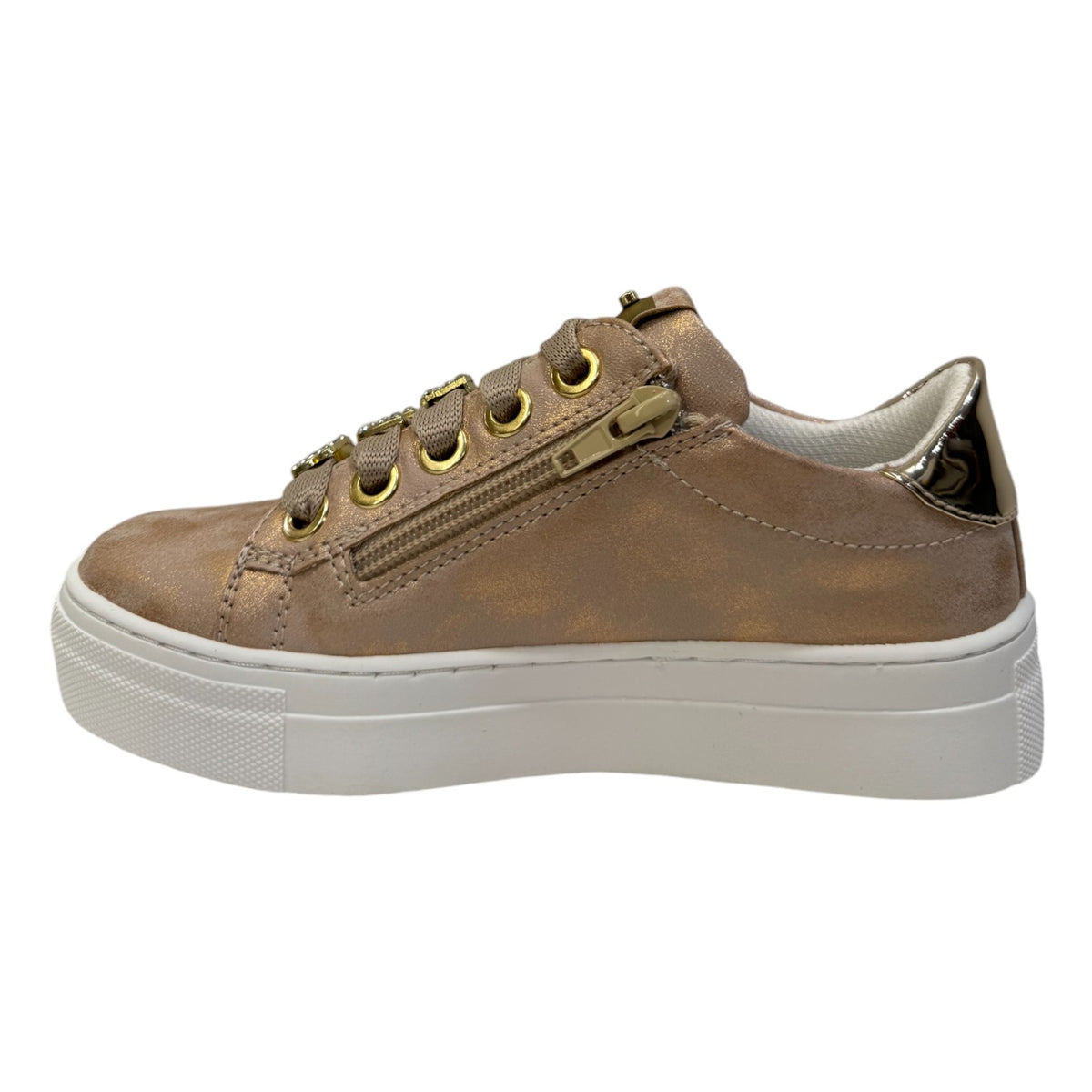 La Sneakers firmata 4US by Paciotti, con accessori gioiello removibili sui lacci realizzata in ecopelle effetto laminato è caratterizzata da inserto sul tallone dorato effetto specchiato e da una comoda e pratica chiusura che facilita la calzata con chiusura e zip laterale, l'interno è foderato in tessuto con morbido sottopiede rivestito in pelle.