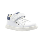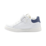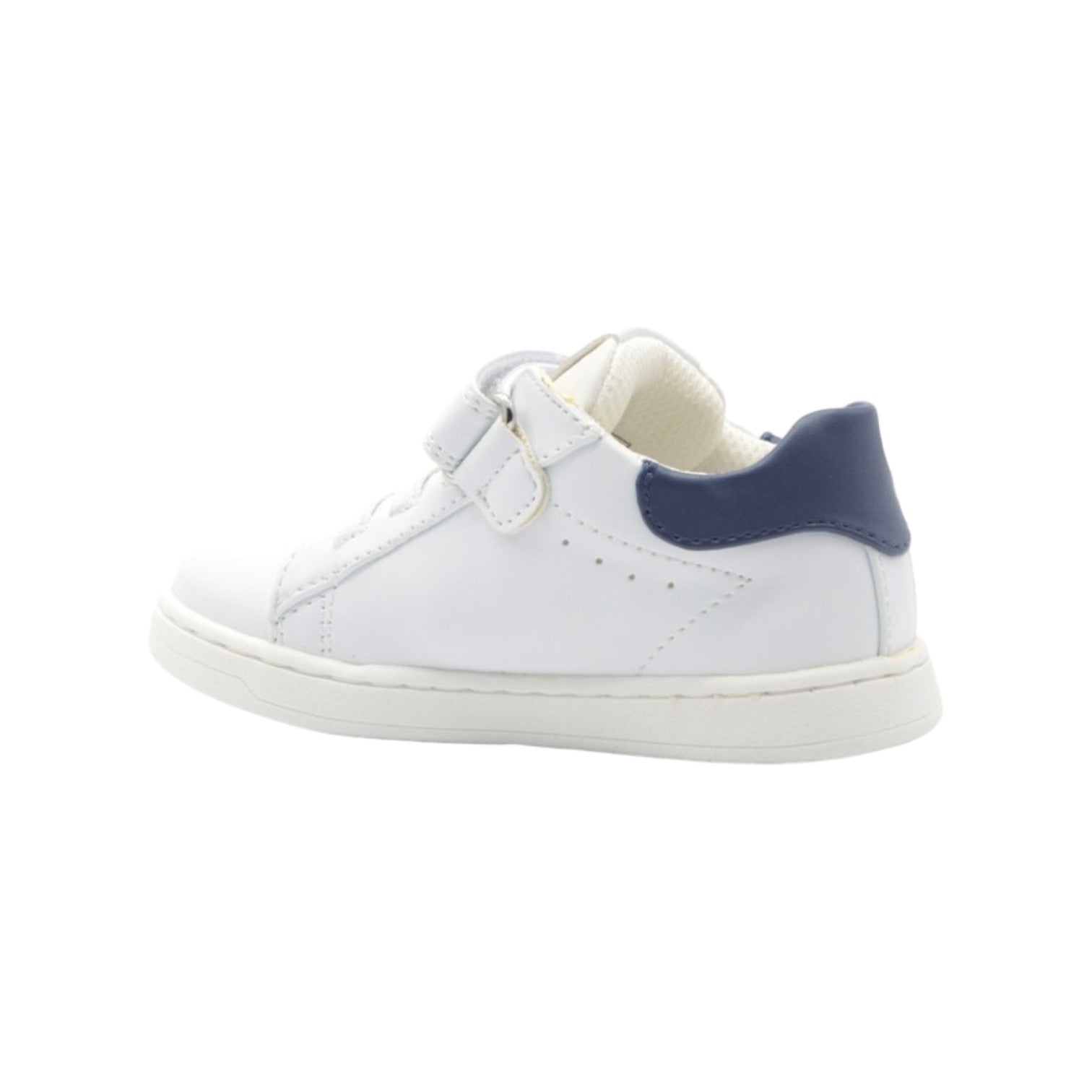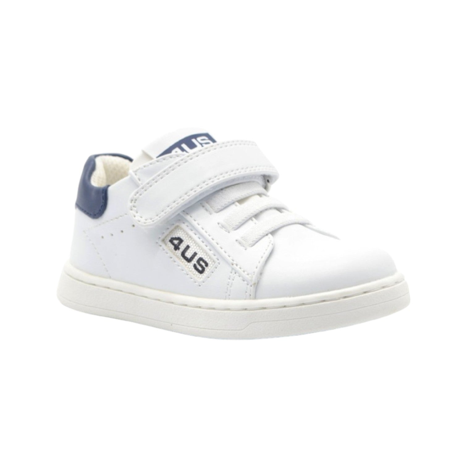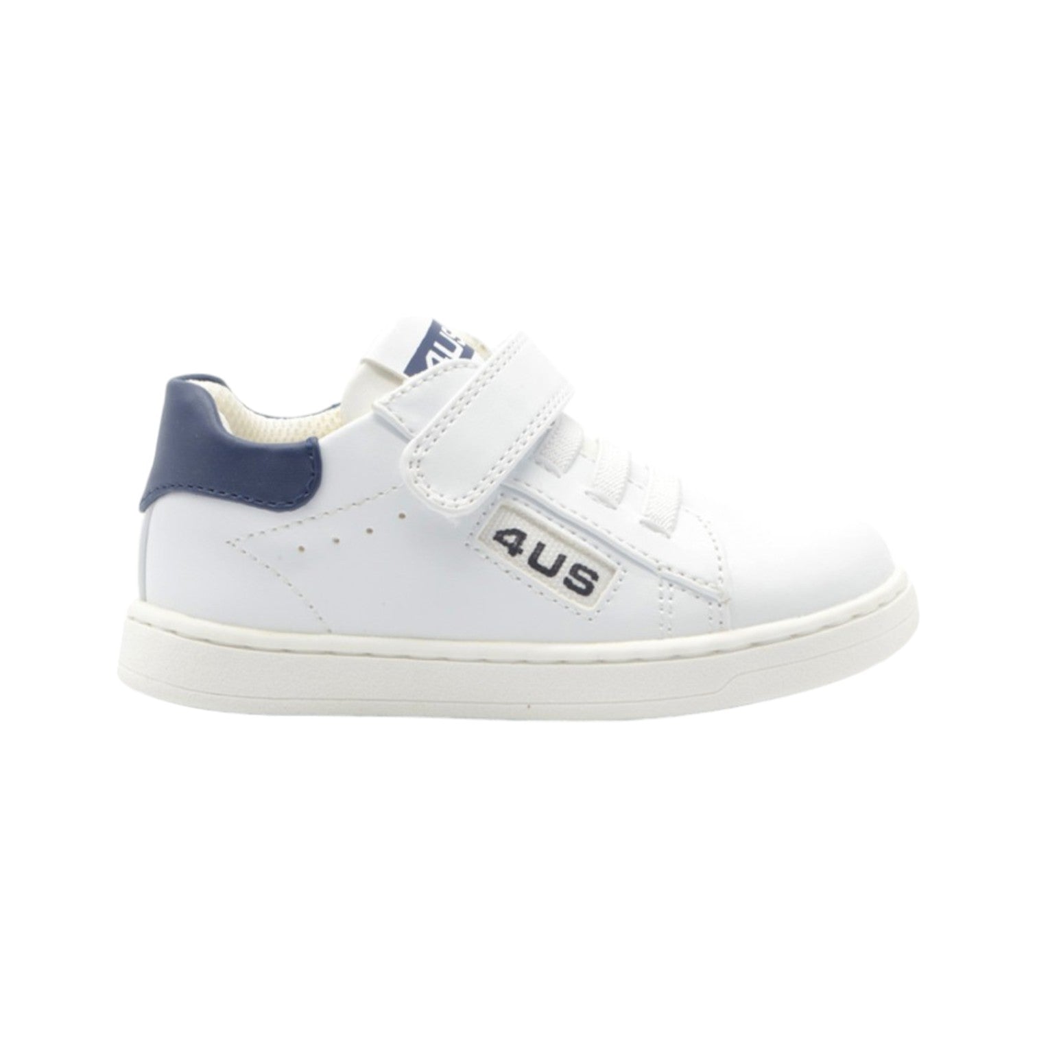 La Sneakers firmata 4US by Paciotti, realizzata in ecopelle bianca è caratterizzata da dettagli blu e da una comoda e pratica chiusura con strappo, mentre l'interno è foderato in tessuto con sottopiede in pelle.