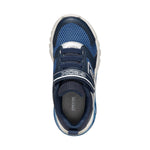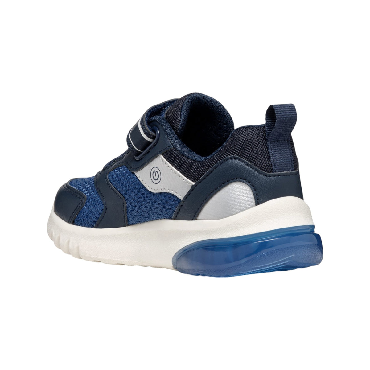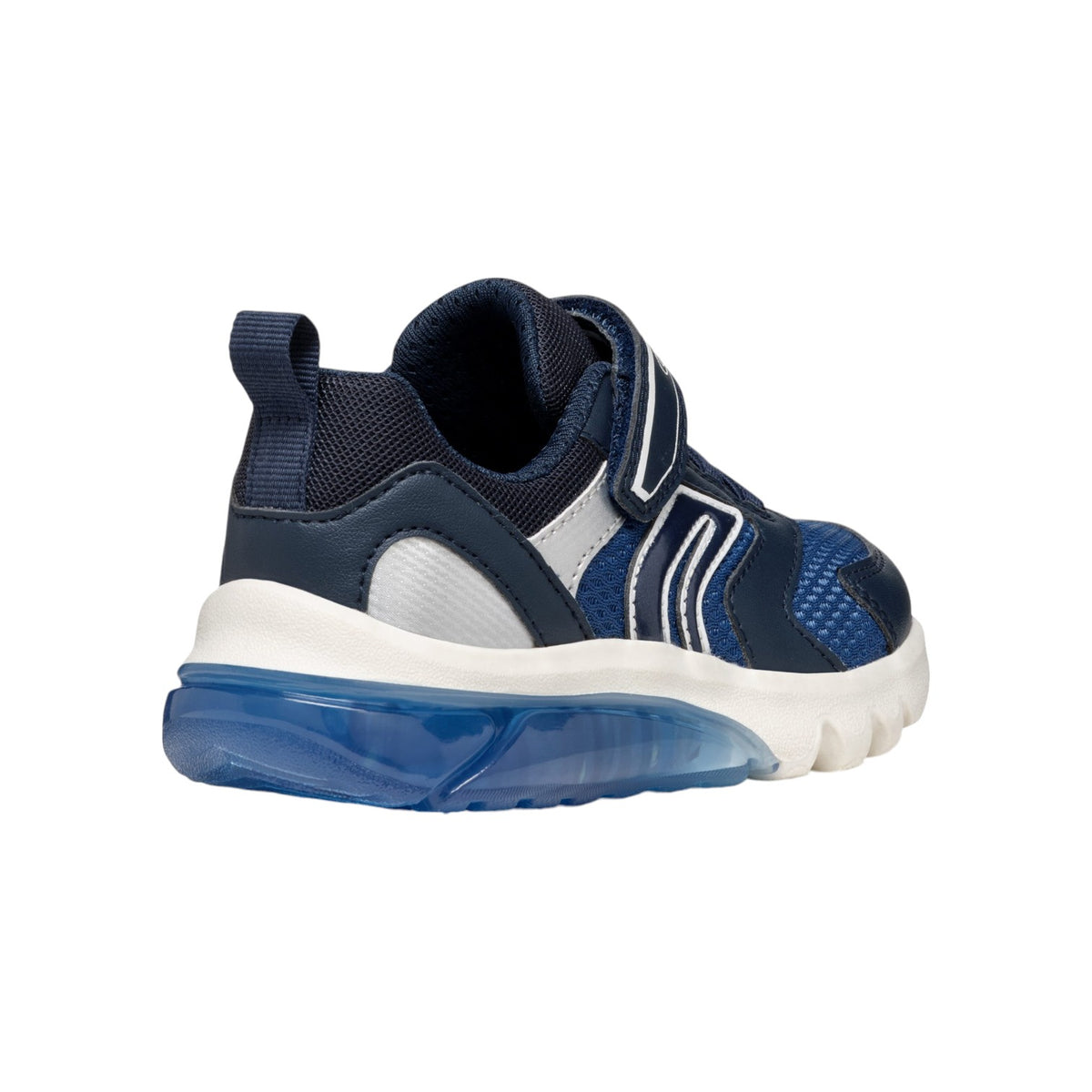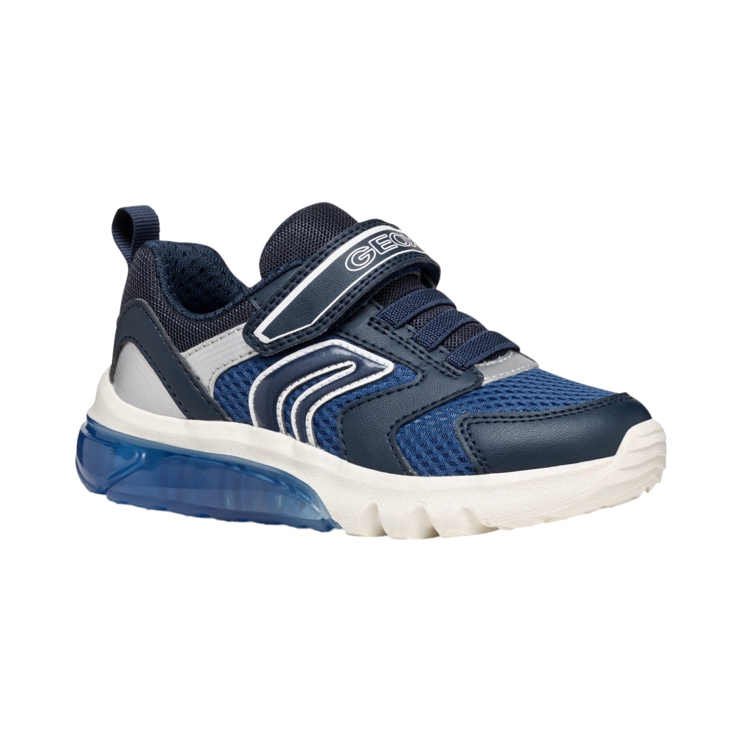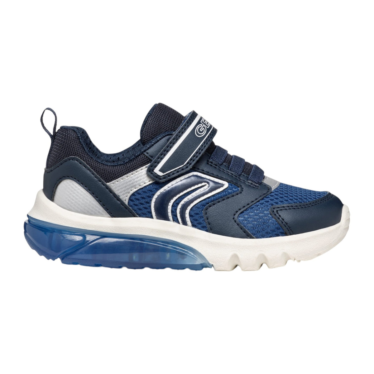 La Sneakers firmata Geox, realizzata con luci integrate nella suola, questa attraente versione blu navy e argento scuro di Ciberdron sarà di grande aiuto per le giornate a scuola e i pomeriggi di gioco. Realizzata in tessuto e materiale effetto pelle martellata, è caratterizzata da plantare estraibile ed è destinata a stupire con il suo design dinamico e i toni sportivi.