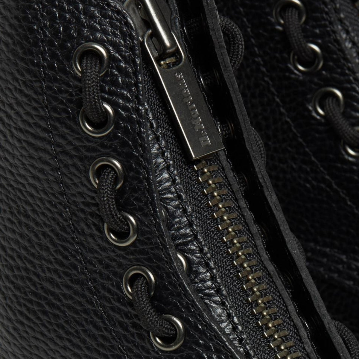 L'Anfibio firmato Dr. Martens, realizzata in pelle martellata è caratterizzata da cuciture gialle a vista e linguetta logata sulla parte superiore del tallone, per facilitare la calzata. Otto occhielli con due tipi di allacciatura: laccio tono su tono e zip frontale (removibile).