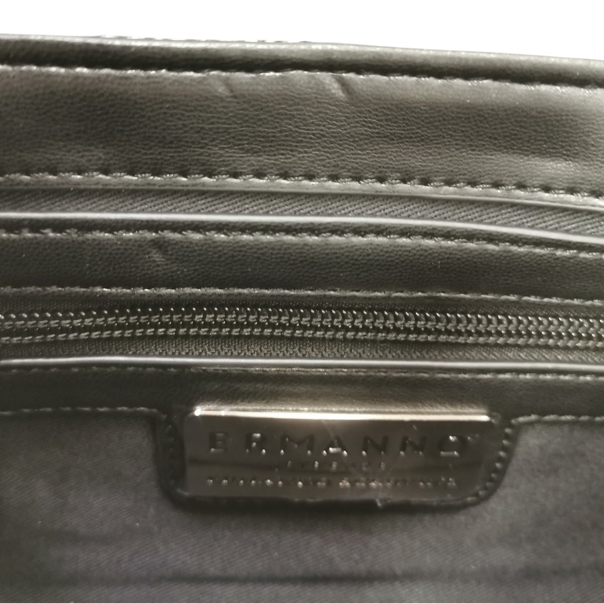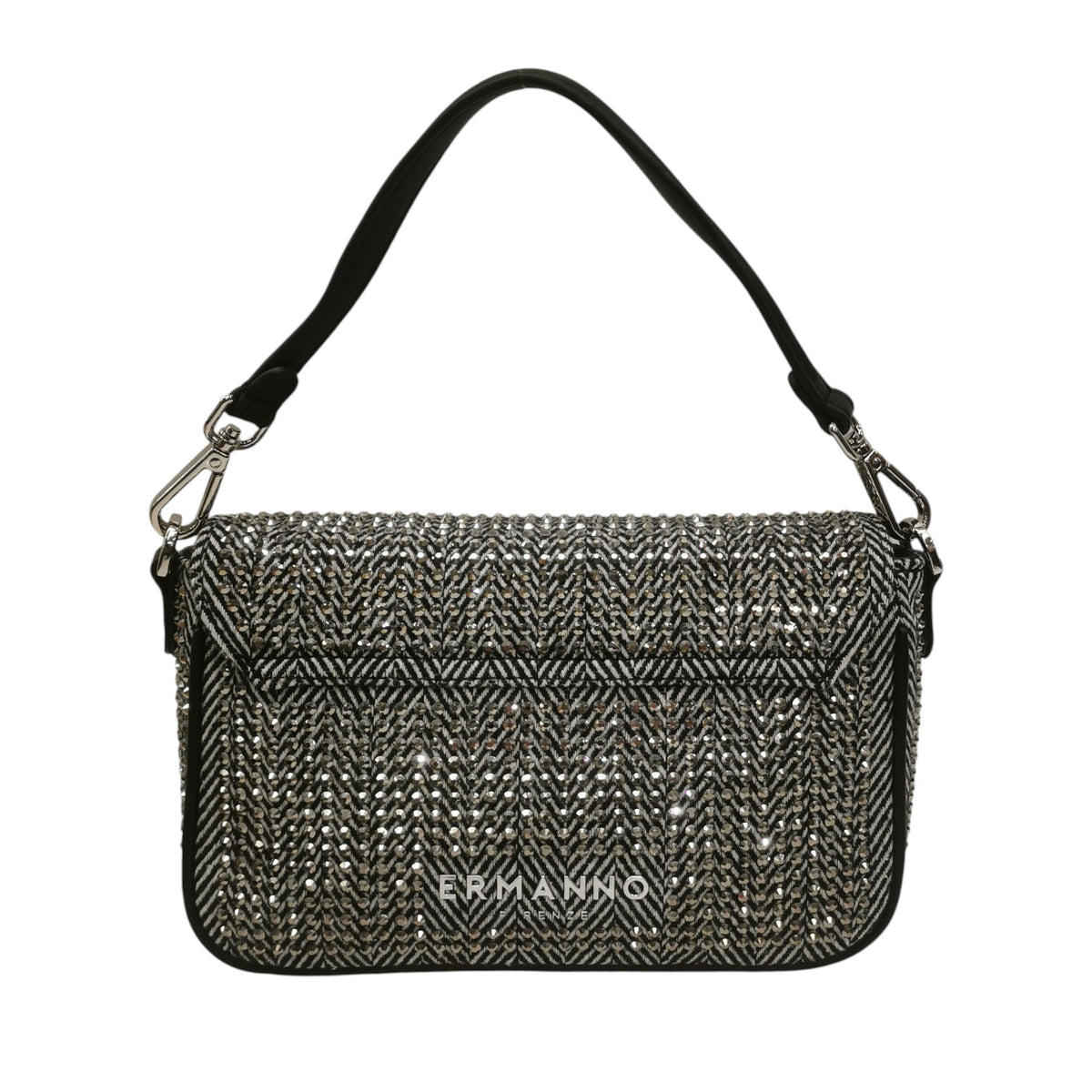 La Borsa a mano firmata Ermanno Scervino, realizzata in tessuto herringbone offre un motivo distintivo, mentre il nero la rende versatile e facilmente abbinabile è caratterizzata da un applicazione di strass e manico removibile con chiusura a bottone magnetico.