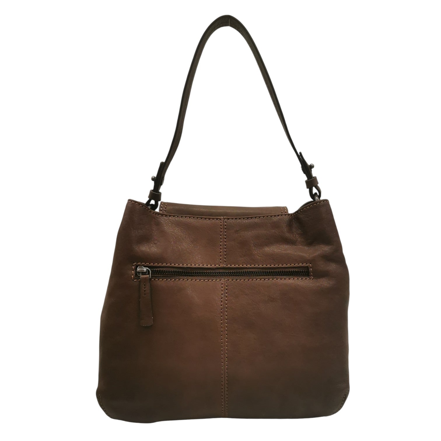 La Borsa a spalla firmata Gianni Conti, realizzata in pelle con la sua silhouette morbida qui proposta nella variante cioccolato è caratterizzata da cinturino frontale come decorazione accompagnato da una chiusura a bottoncino magnetico, all'interno troviamo 3 scomparti di cui un taschino con zip.