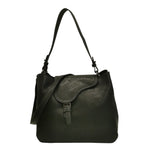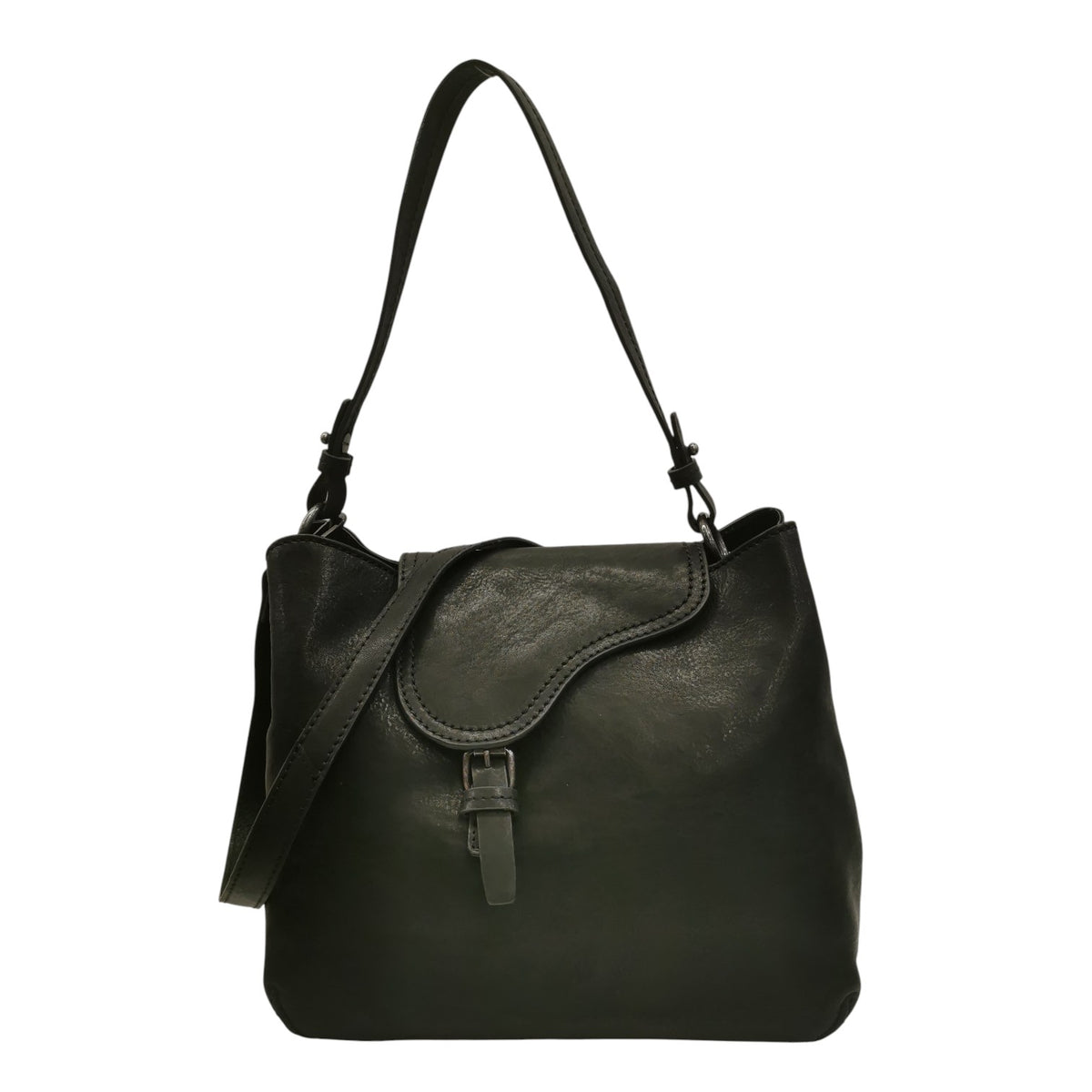 La Borsa a spalla firmata Gianni Conti, realizzata in pelle con la sua silhouette morbida qui proposta nella variante nera è caratterizzata da cinturino frontale come decorazione accompagnato da una chiusura a bottoncino magnetico, all'interno troviamo 3 scomparti di cui un taschino con zip.