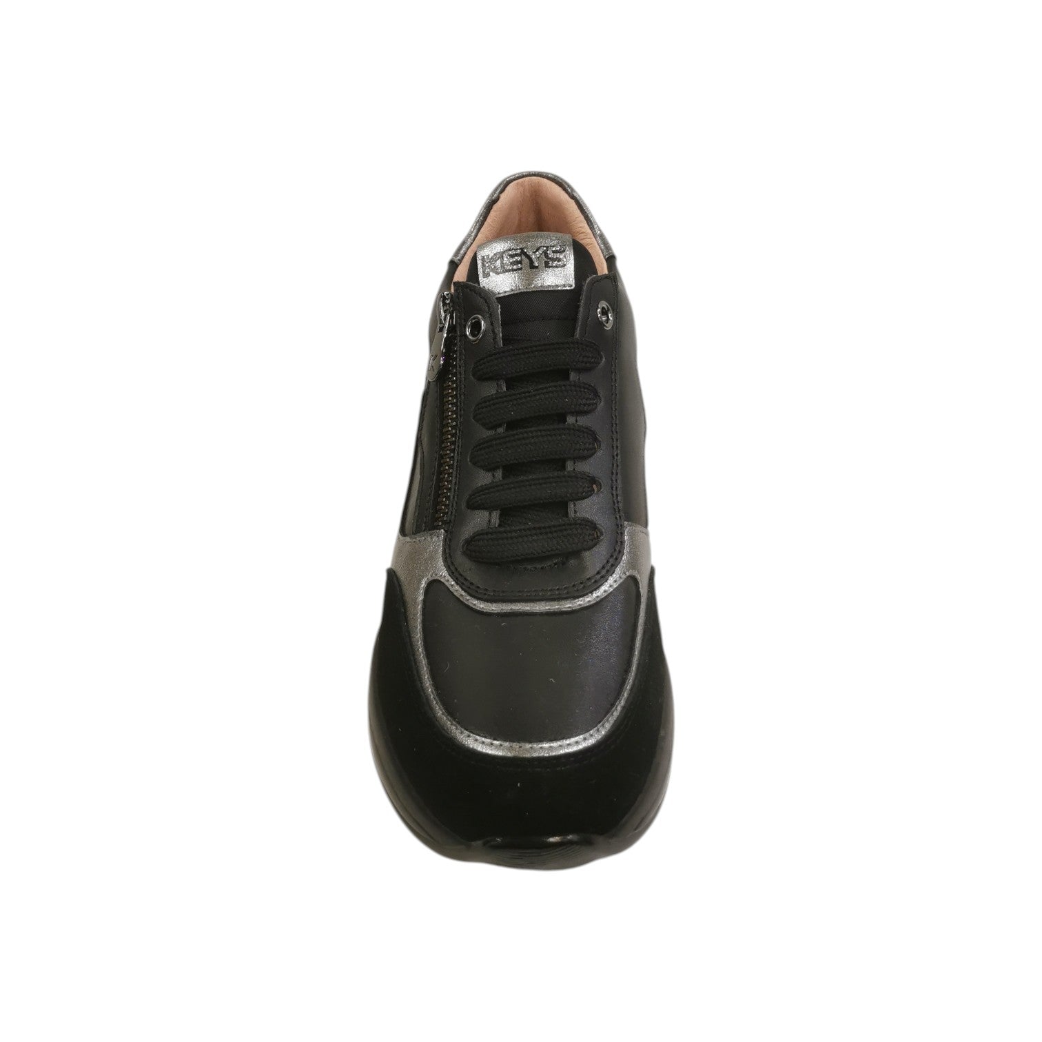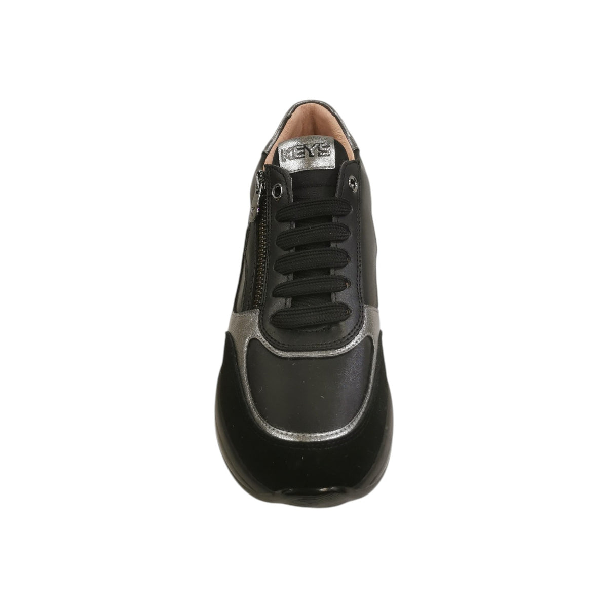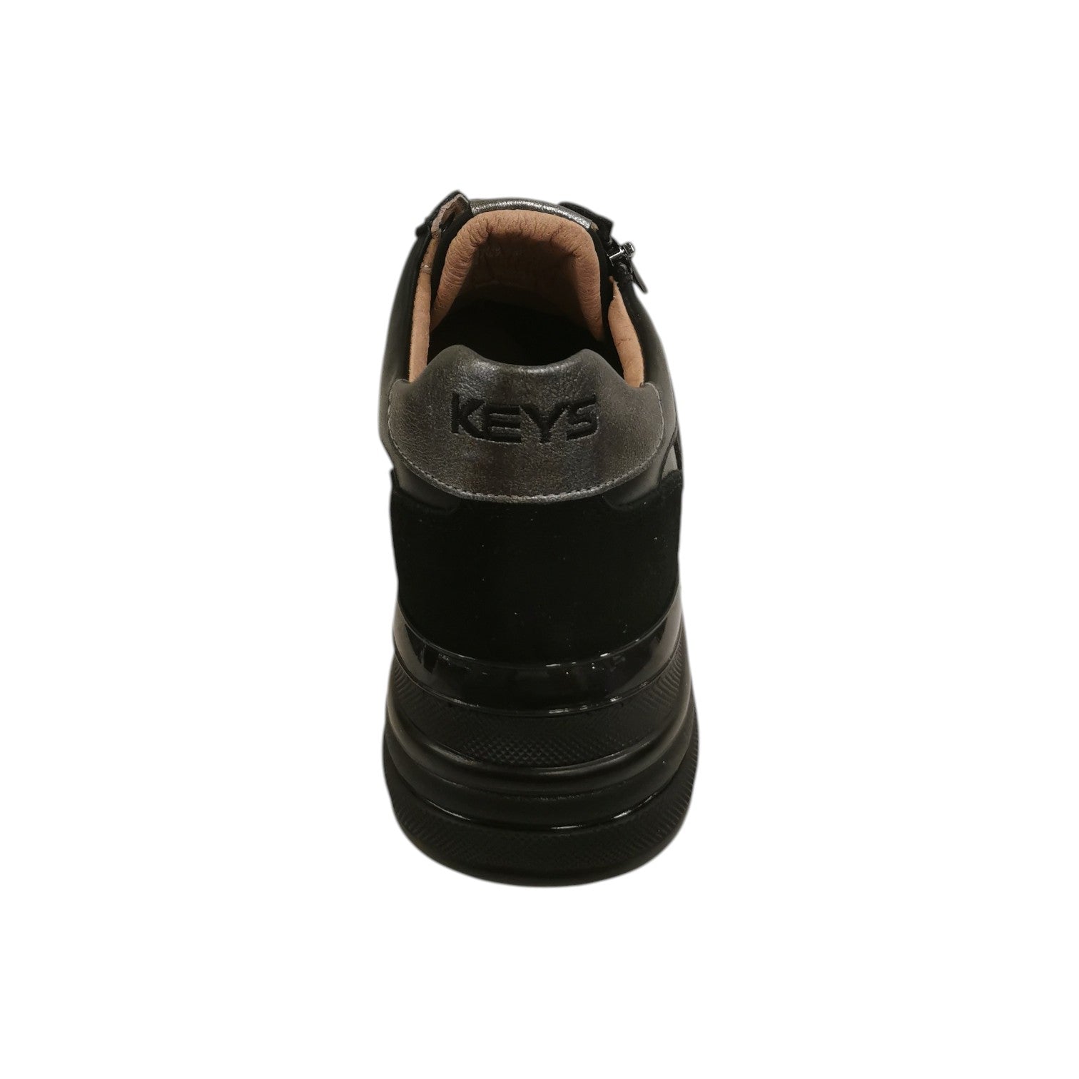 La Sneakers firmata Keys, realizzata in pelle nera è caratterizzata da inserti in camoscio presenta una comoda chiusura con lacci e zip per facilitarne la calzata. Morbido sottopiede in pelle e fondo ammortizzato, un modello pratico e versatile, adatto alle frenetiche giornate quotidiane.