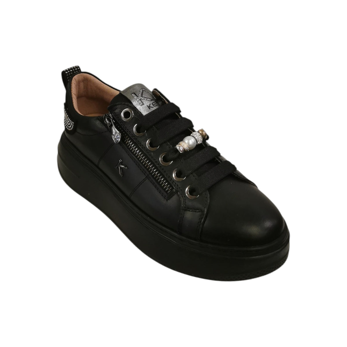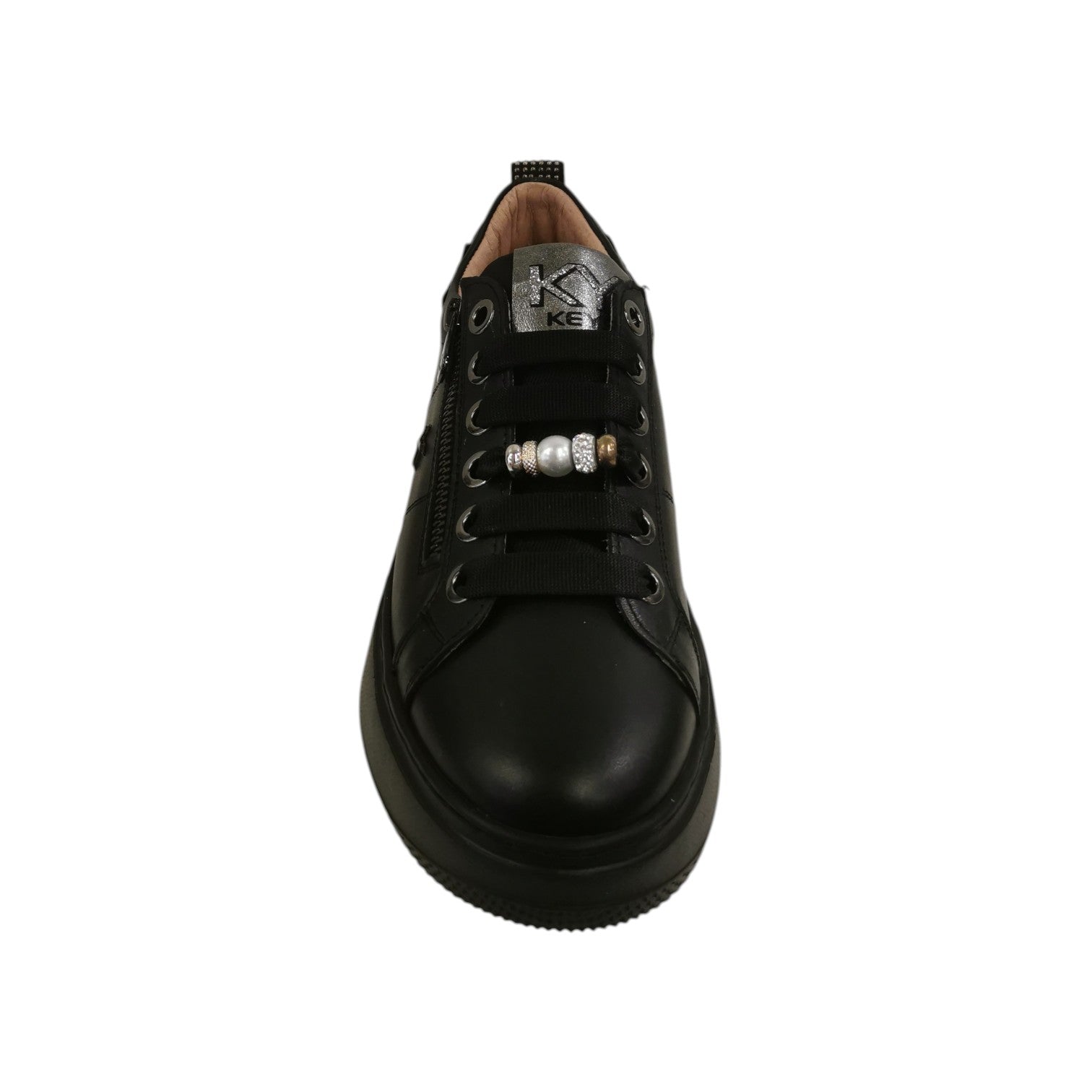 La Sneakers firmata Keys, realizzata in pelle color nero è caratterizzata da inserti con mini strass sul tallone presenta una comoda chiusura con lacci e zip per facilitarne la calzata. Morbido sottopiede in pelle e fondo ammortizzato, un modello pratico e versatile, adatto alle frenetiche giornate quotidiane.