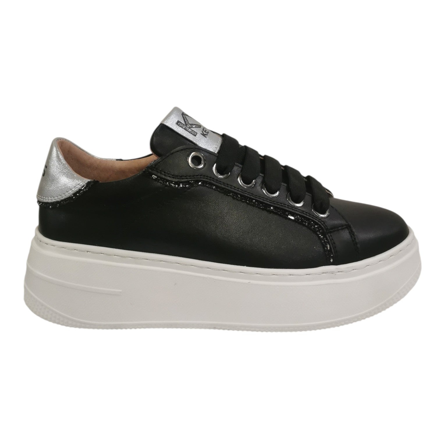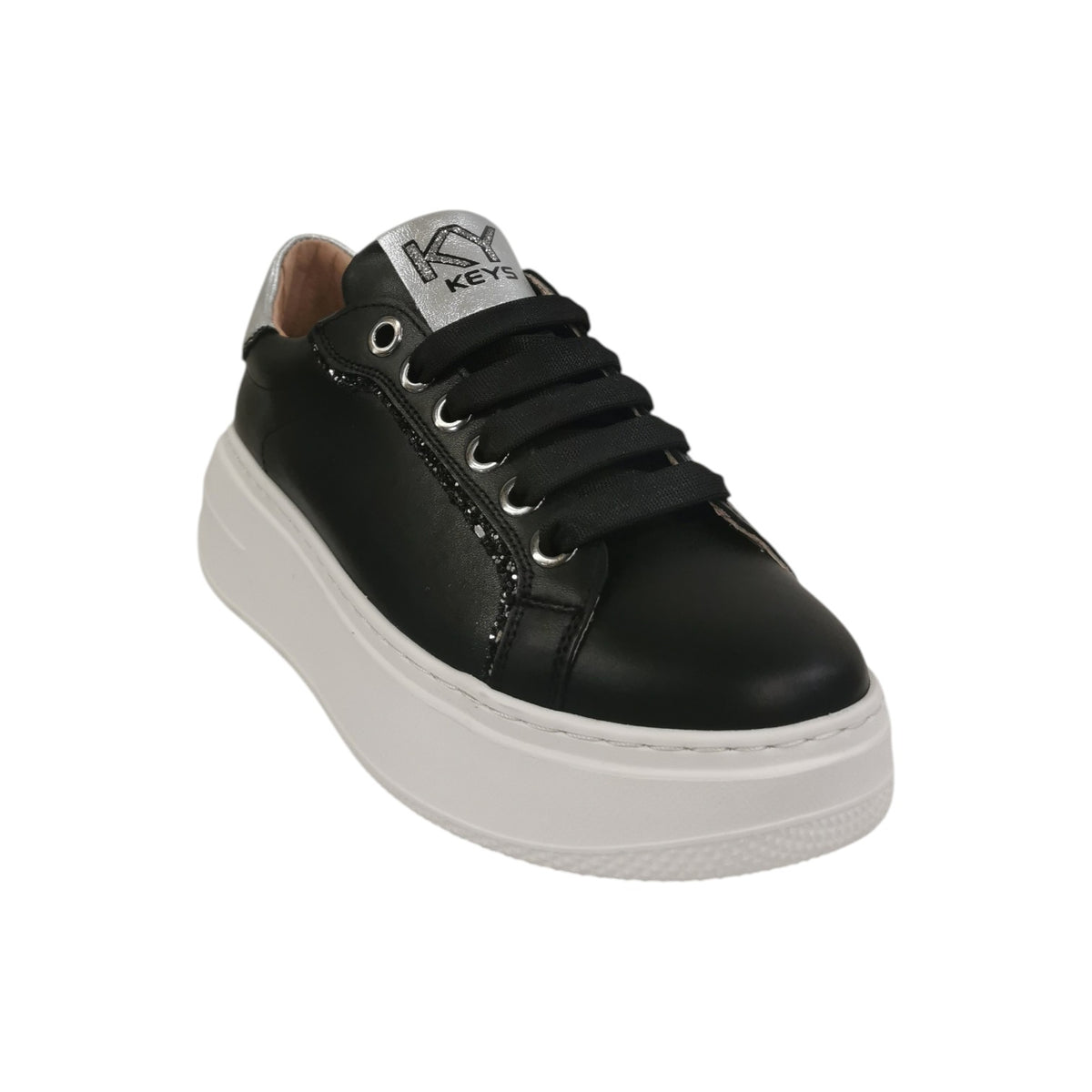 La Sneakers firmata Keys, realizzata in pelle color nero è caratterizzata da inserti con glitter laterali presenta una comoda chiusura con lacci per facilitarne la calzata. Morbido sottopiede in pelle e fondo ammortizzato, un modello pratico e versatile, adatto alle frenetiche giornate quotidiane.