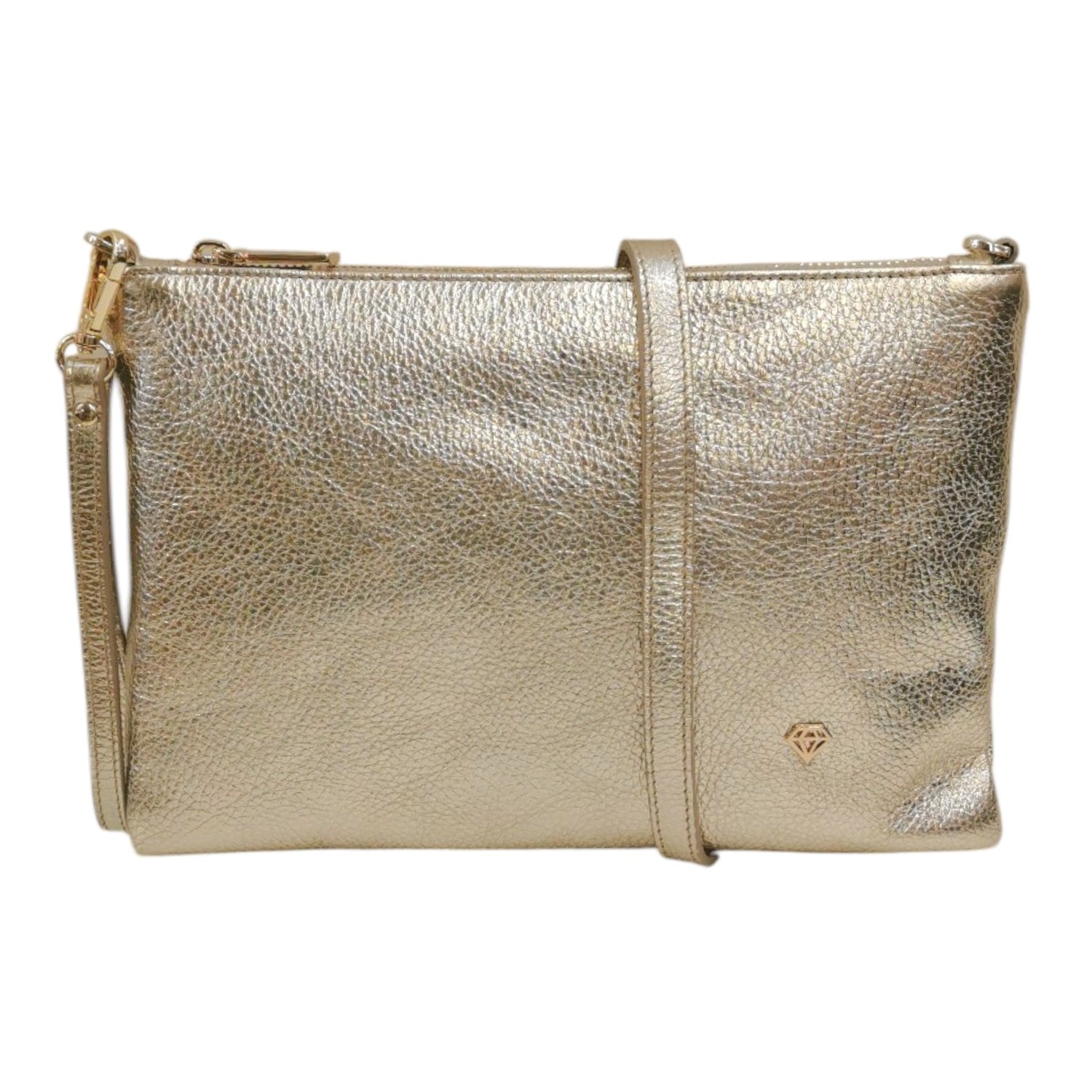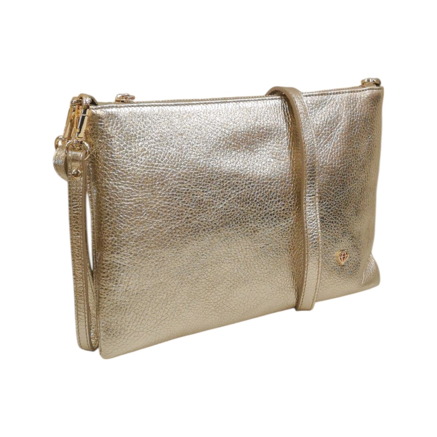 La Pochette firmata Gaelle è realizzata in ecopelle, presenta stampa logo a caldo sulla parte frontale, è dotata di un polsino removibile. L'interno è foderato in tessuto ed ha un taschino con cerniera e targhetta logo.