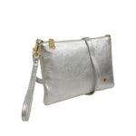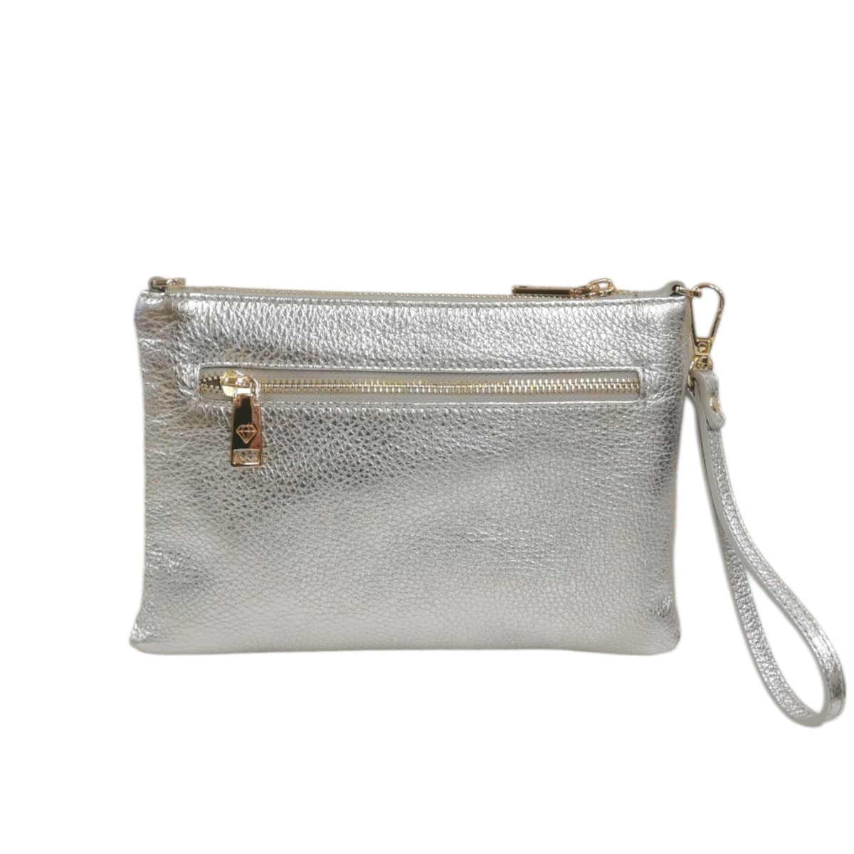 La Pochette firmata Caleidos, realizzata in pelle martellata qui proposta nella variante argento è caratterizzata da tracolla removibile e da polsino per portarla a mano, l'interno è foderato in tessuto di cui dispone di tasca con zip.