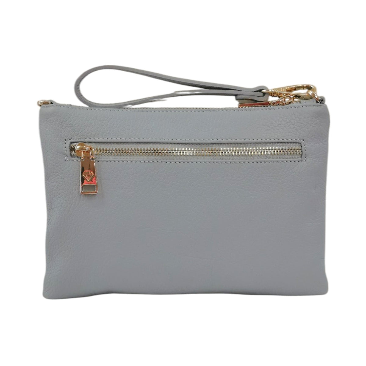 La Pochette firmata Caleidos, realizzata in pelle martellata qui proposta nella variante azzurro è caratterizzata da tracolla removibile e da polsino per portarla a mano, l'interno è foderato in tessuto di cui dispone di tasca con zip.