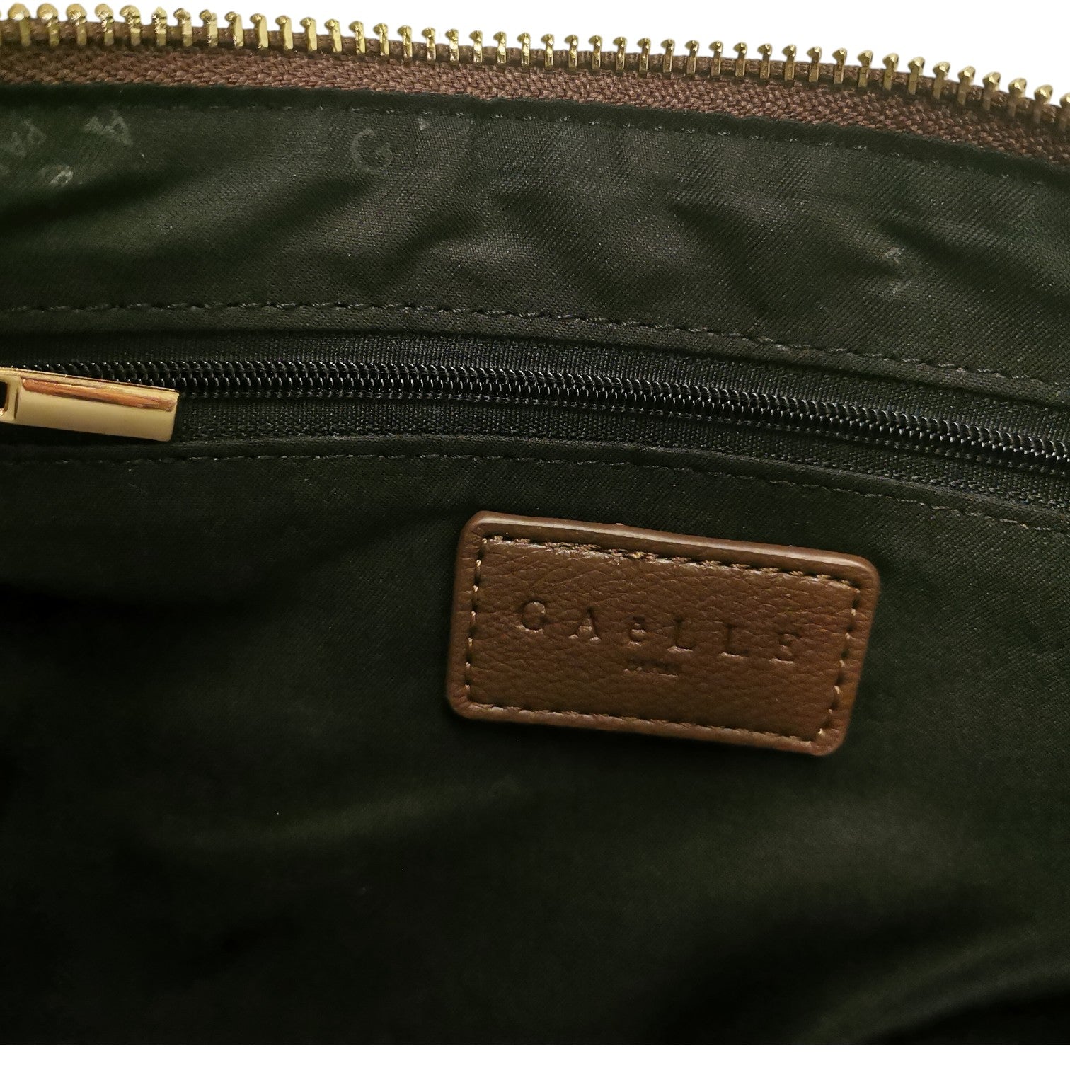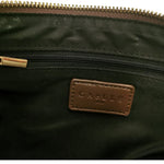 La Pochette firmata Gaelle è realizzata in ecopelle in color bruciato, decorata da lettering del brand a contrasto. L'interno è rivestito in tessuto ed è molto capiente, inoltre dispone di due tasche interne, di cui una con chiusura a cerniera e targhetta logo, infine è presente un laccio da polso removibile.