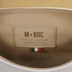 La Pochette firmata M Brc, della Linea Jolly realizzata in vera pelle martellata è caratterizzata da tracolla a catena dorata removibile e da manico pe portarla a spalla, presenta una chiusura con bottoncino, ed all'interno non presenta taschini.