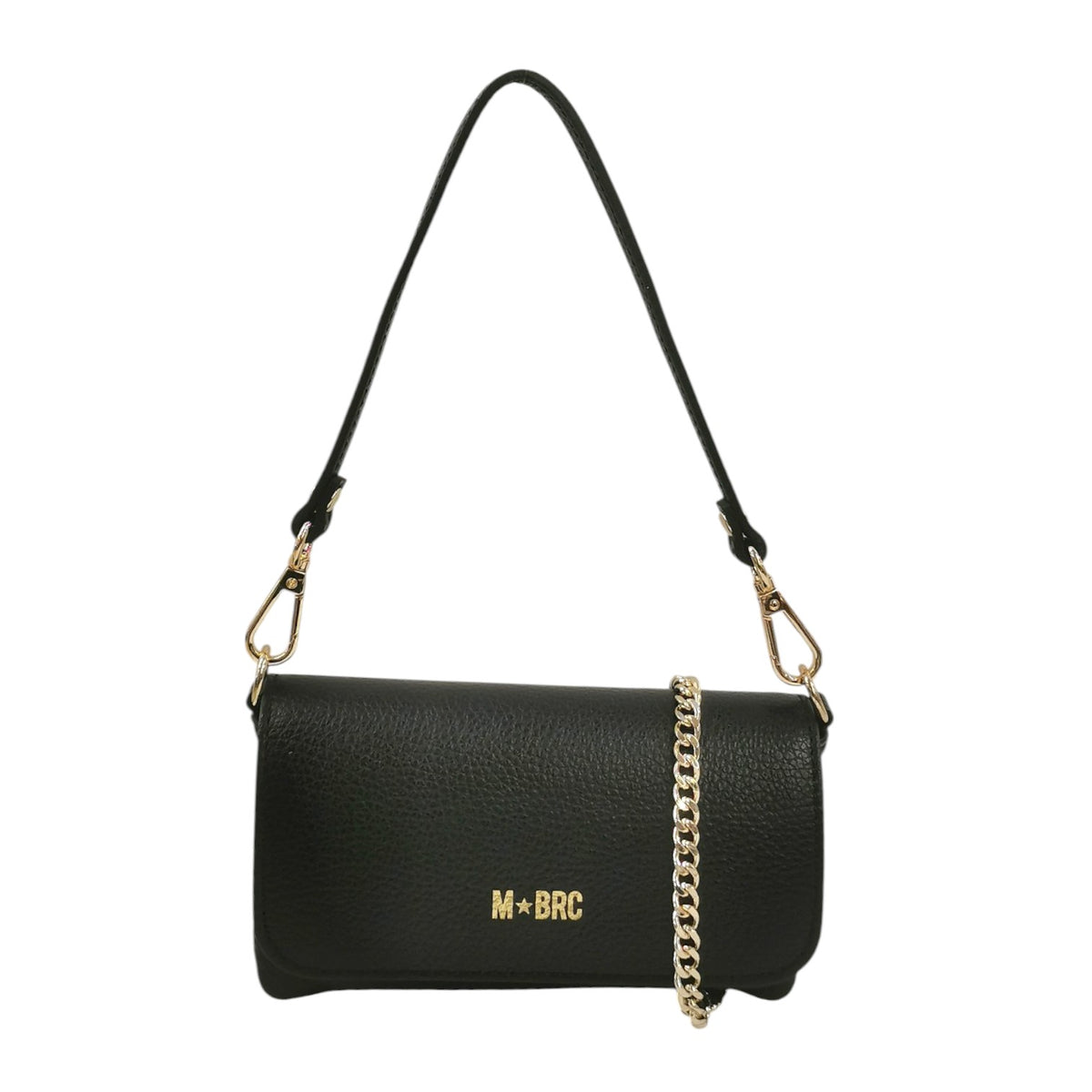La Pochette firmata M Brc, della Linea Jolly realizzata in vera pelle martellata è caratterizzata da tracolla a catena dorata removibile e da manico pe portarla a spalla, presenta una chiusura con bottoncino, ed all'interno non presenta taschini.