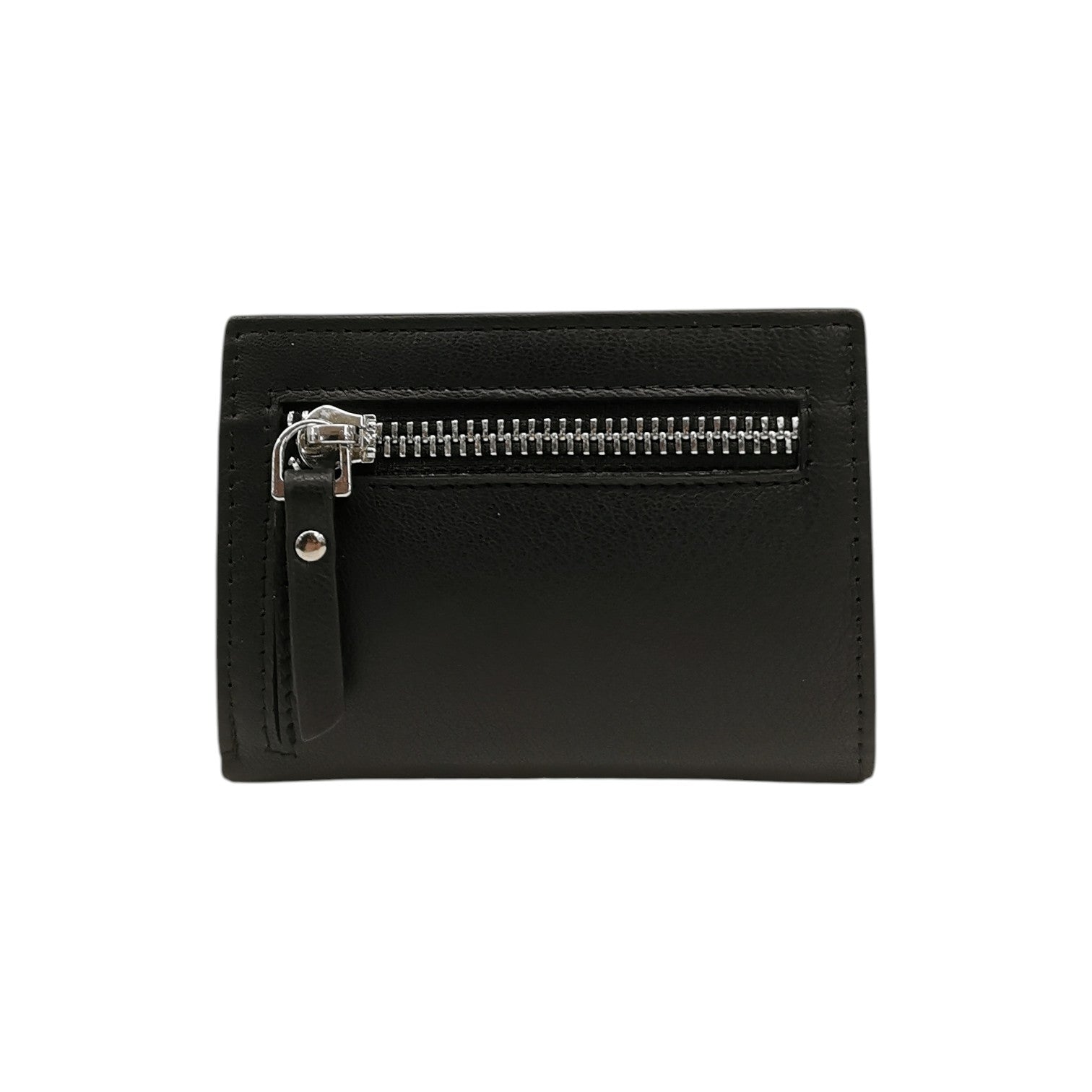 Il Portacarte firmato John Richmond, realizzato in pelle nera effetto saffiano è caratterizzato da logo in rilievo sulla parte frontale, all'interno sono presenti scomparti dedicati per banconote e carte, con taschino per le monete sul retro.
