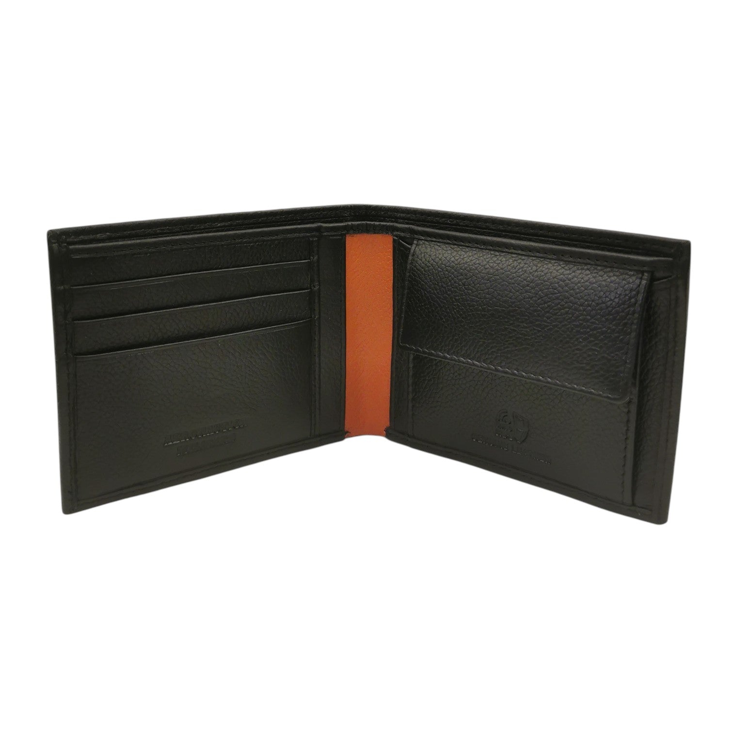 Il Portafoglio firmato Aeronautica Militare, realizzato in pelle nera all’interno possiamo trovare 4 scomparti porta carte e un comodo porta-spicci, il tutto abbellito dal dettaglio centrale color arancione. Il prodotto si caratterizza per l’aquila in metallo, il logo Aeronautica Militare stampato a fuoco e l’inserto tricolore.