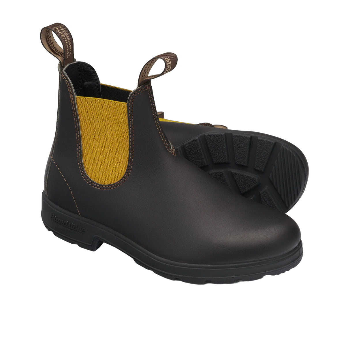 Beatles firmato Blundstone, è realizzato in pelle resistente all'acqua modello marrone, con elastici laterali color ocra intenso per un tocco fashion. Tomaia liscia con impunture decorative, linguette per aiutare la calzata e comoda suola in gomma antiscivolo con tallone rialzato.