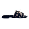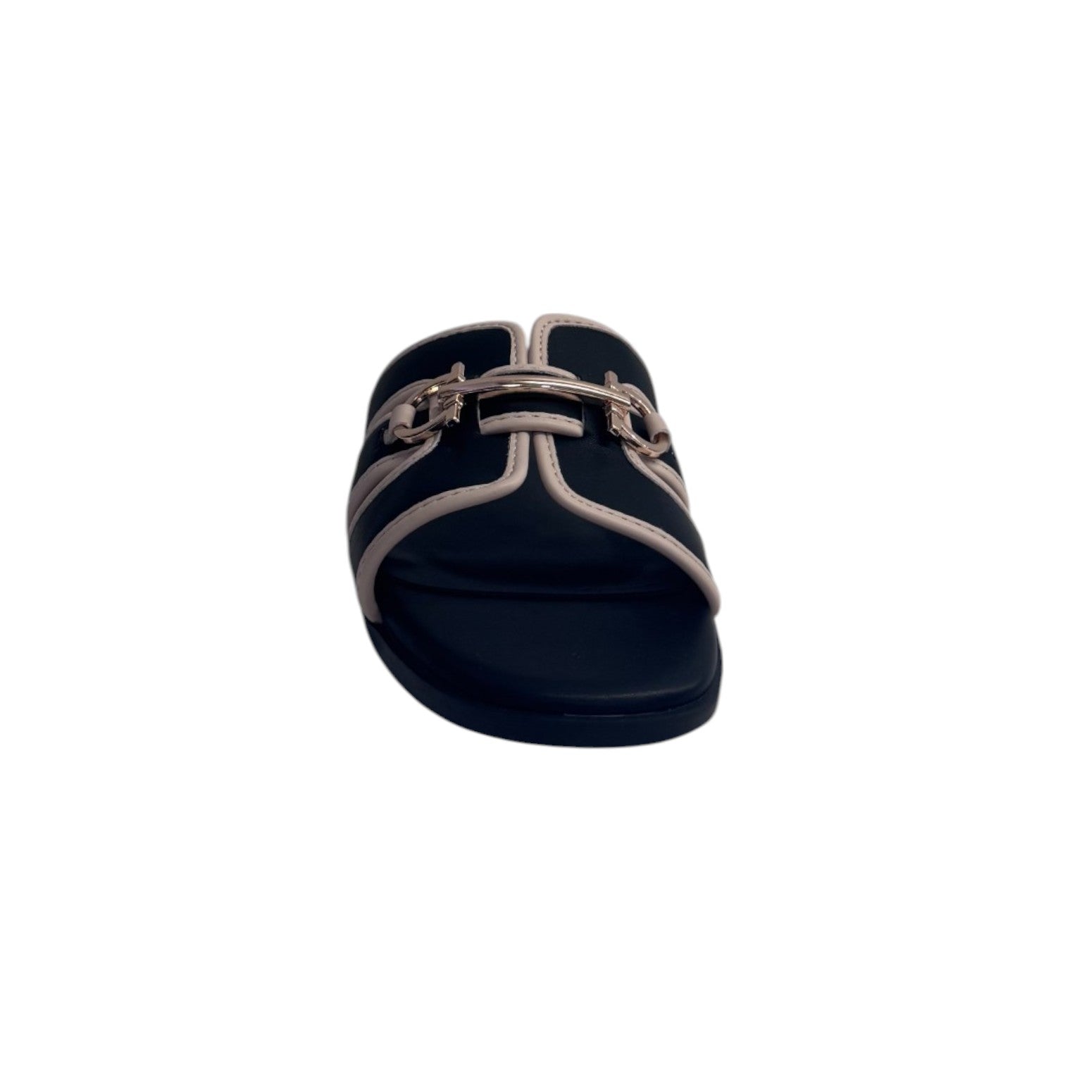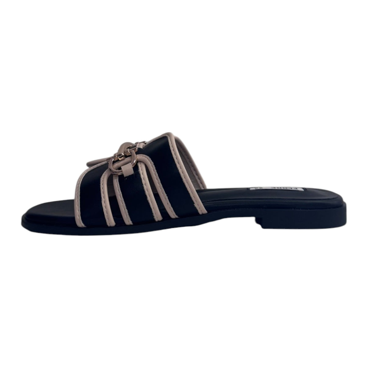 La Ciabatta firmata Ferrè, realizzata in ecopelle è caratterizzata da inserti beige con morsetto frontale in metallo dorato, l'interno è foderato in ecopelle con plantare in vera pelle, che offre comfort e lusso a ogni passo.
