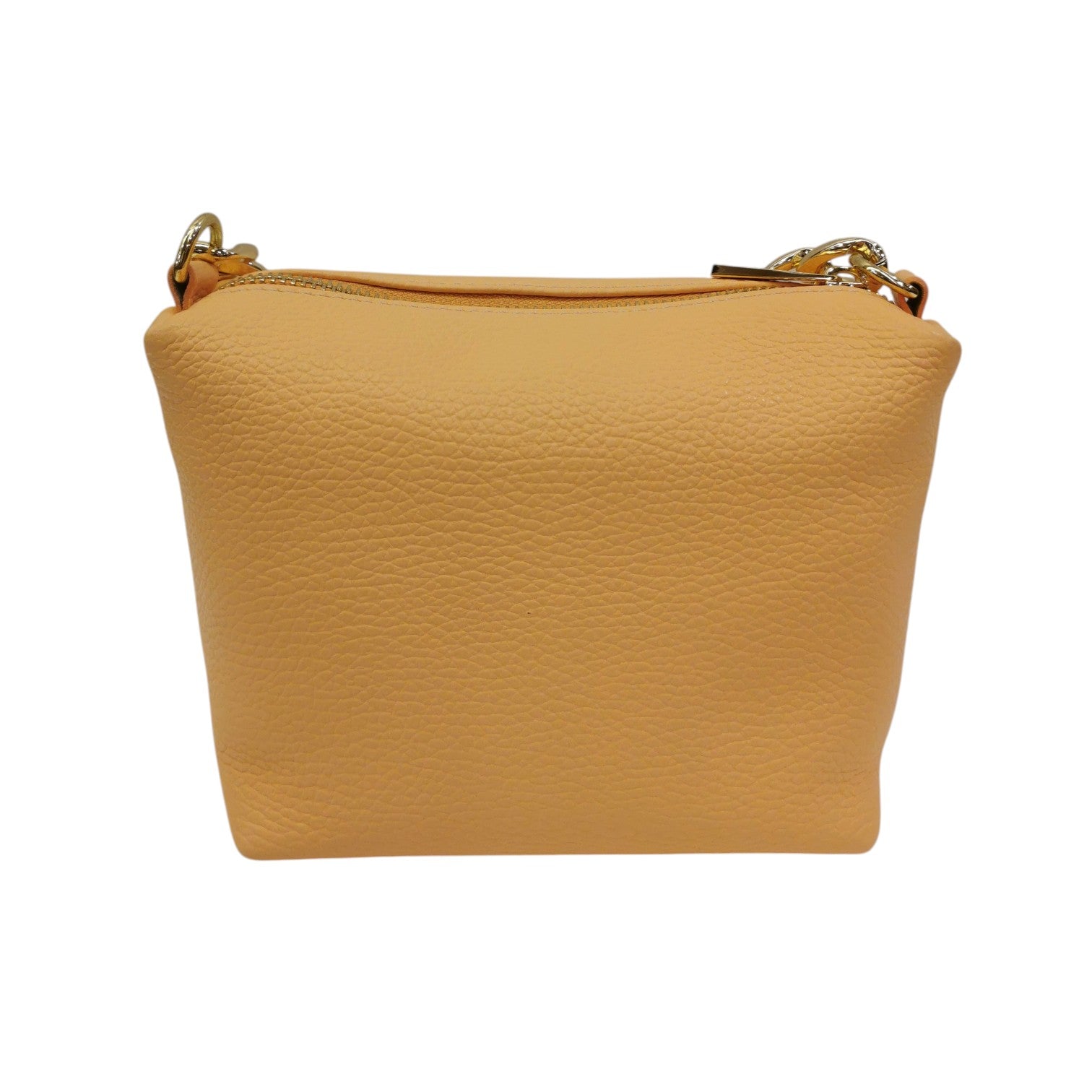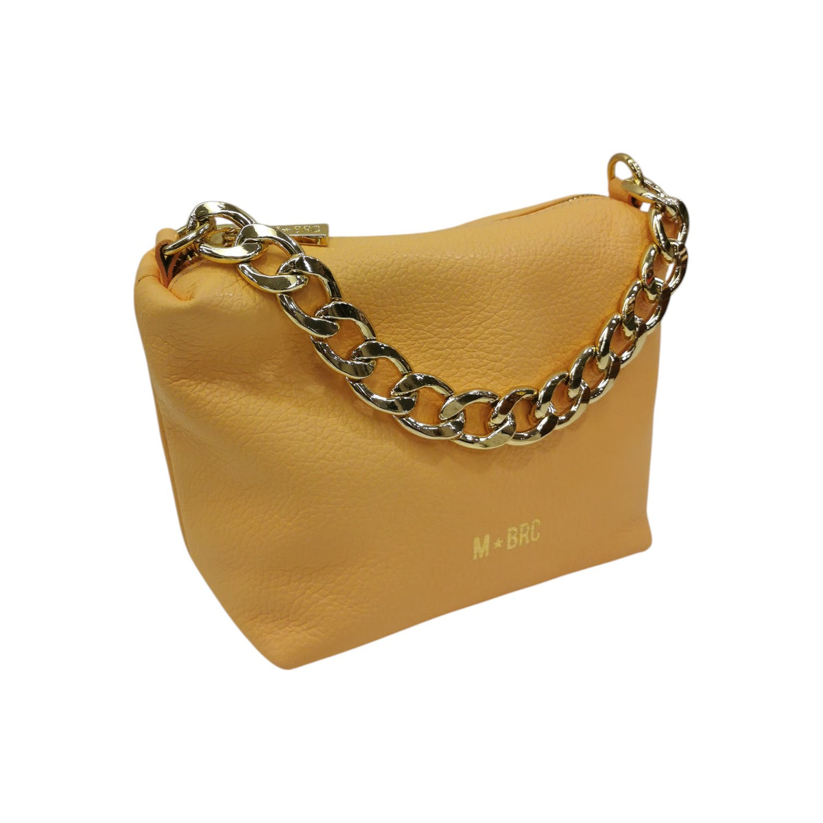 La Borsa a mano firmata M Brc, della Linea Jolly realizzata in vera pelle martellata è caratterizzata da manico a catena dorata, presenta l'interno foderato in tessuto di cui non possiede tasche con zip.