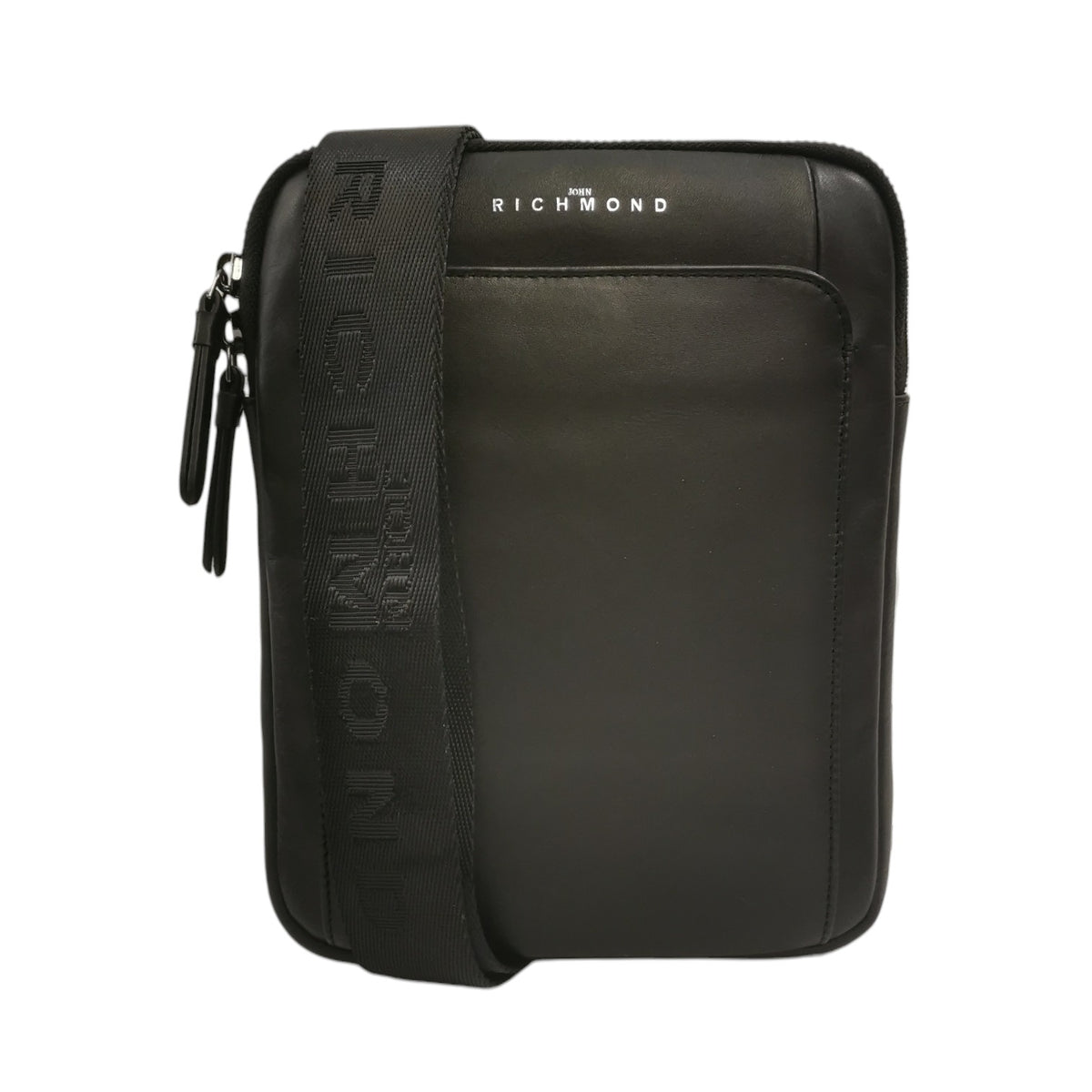 Il Borsello firmato John Richmond, realizzato in morbida pelle è caratterizzato da tracolla in tessuto logata regolabile e da doppio scomparto chiusi a zip doppio cursore foderati in tessuto di cui dispone di un taschino con zip.