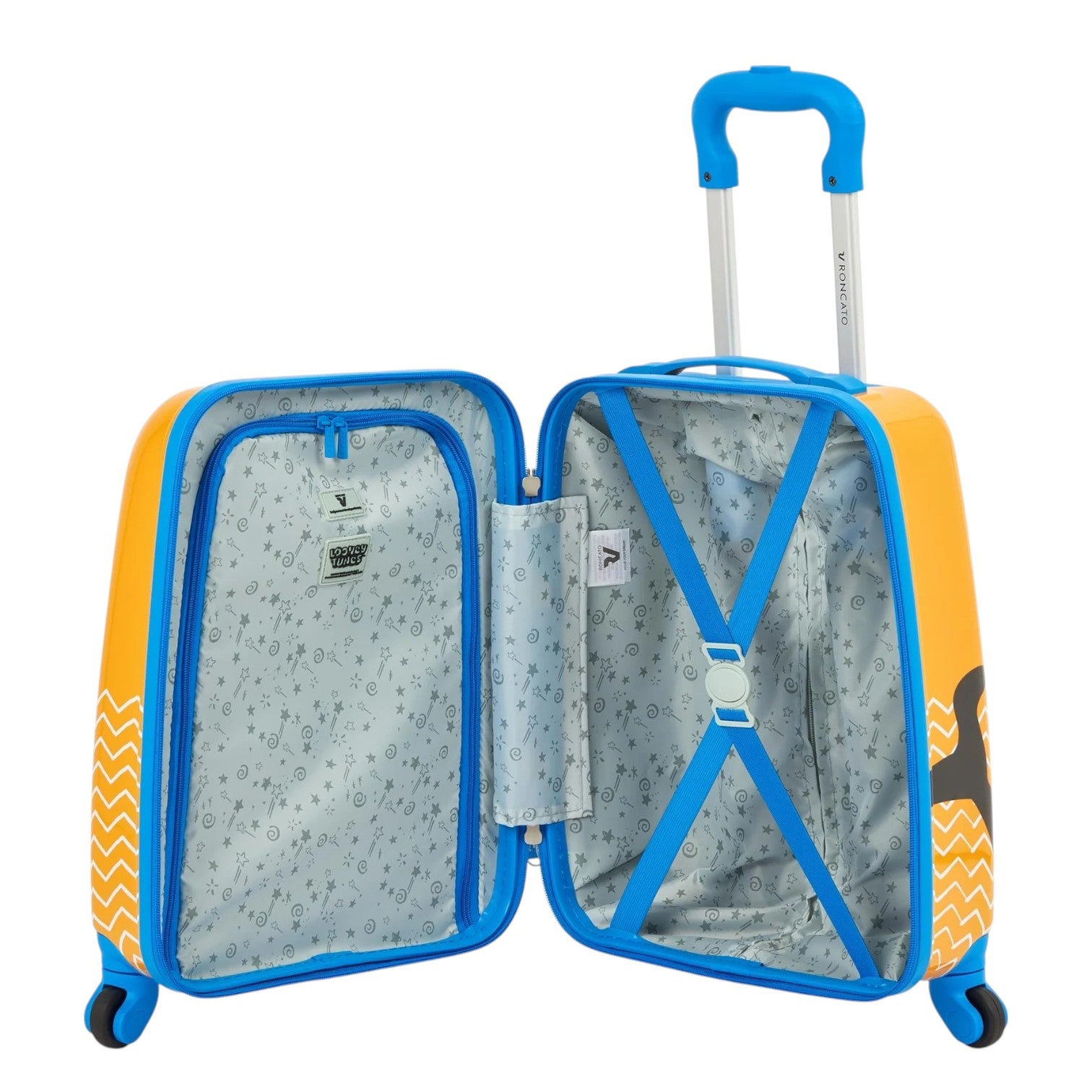 Il Trolley piccolo firmato Roncato, della Linea Looney Tunes Kids realizzato in abs è caratterizzato da quattro ruote scorrevoli per una maggiore mobilità e da uno scomparto con cinghie di blocco e tasca con zip. Questa è una linea unica di valigie e accessori da viaggio pensata per i viaggiatori più giovani.