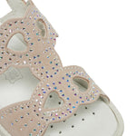Il Sandalo firmato Primigi, ha un design caratterizzato da una serie di intagli a forma di cuore lungo la fascia centrale e laterale, che aggiungono un tocco delicato e giocoso. La tomaia è decorata con piccoli brillantini applicati intorno agli intagli, che donano luminosità. La suola è leggera e flessibile, con un design ergonomico che assicura comfort durante l'uso prolungato.