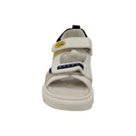 Il Sandalo firmato Balducci, realizzato in ecopelle proposto in questa variante bianca è caratterizzato da inserti blu e gialli e da una comoda chiusura con strappo per maggior comfort, interamente in tessuto per una ottima traspirazione mentre il fondo è in gomma flessibile e antiscivolo.