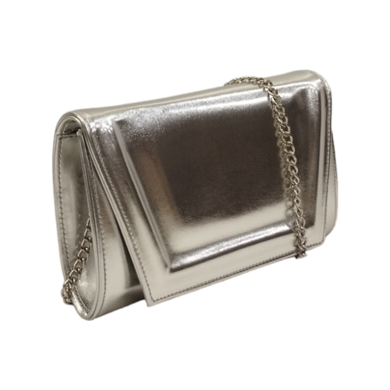 La Pochette firmata Valleverde, realizzata in ecopelle laminata è caratterizzata da catenella removibile, e da interno foderato in tessuto logato con tasca porta oggetti, questo modello è ideale per le cerimonie.