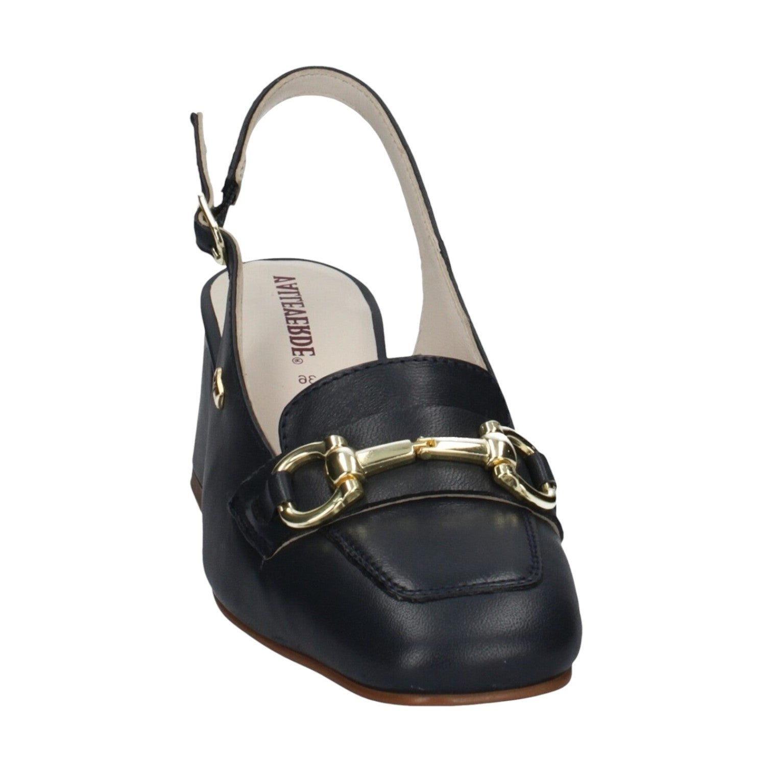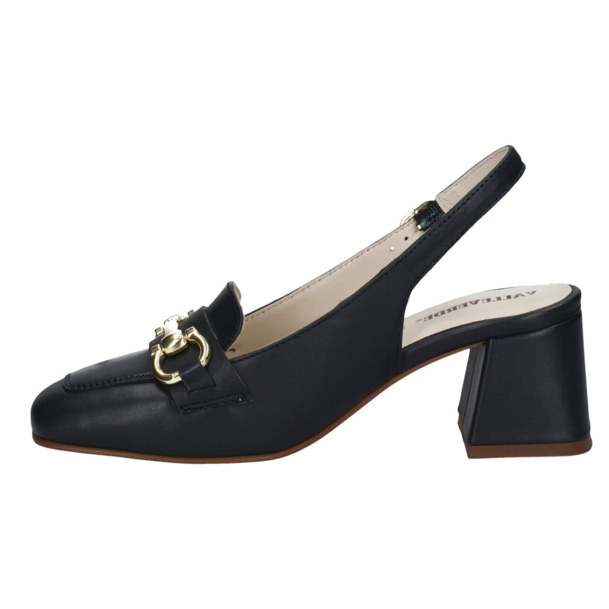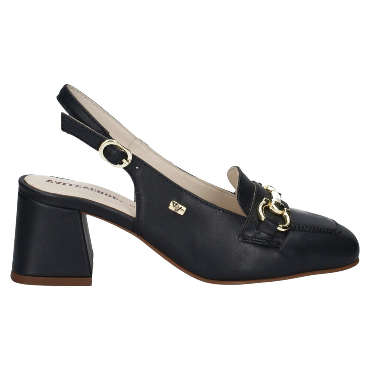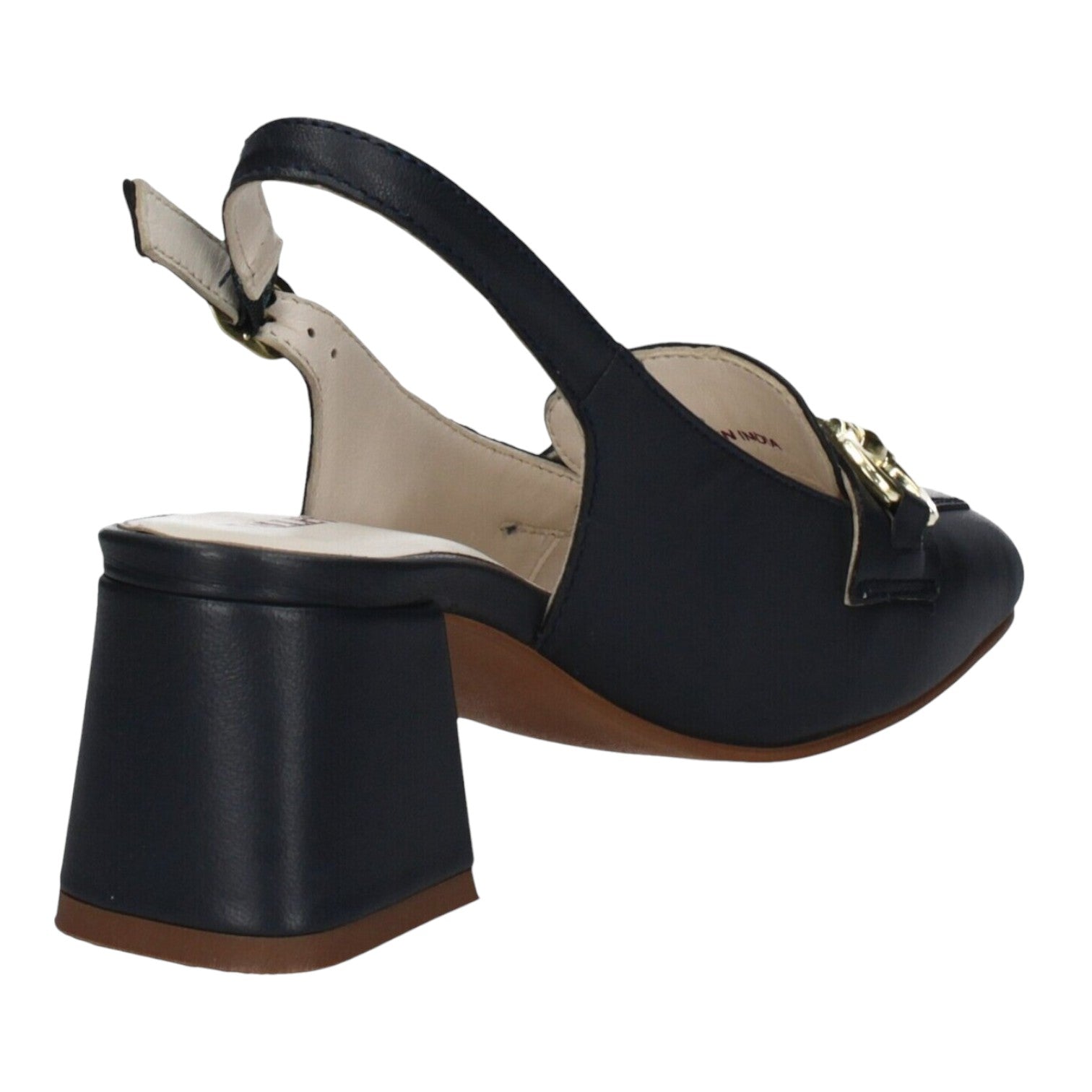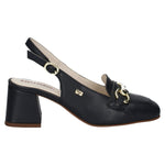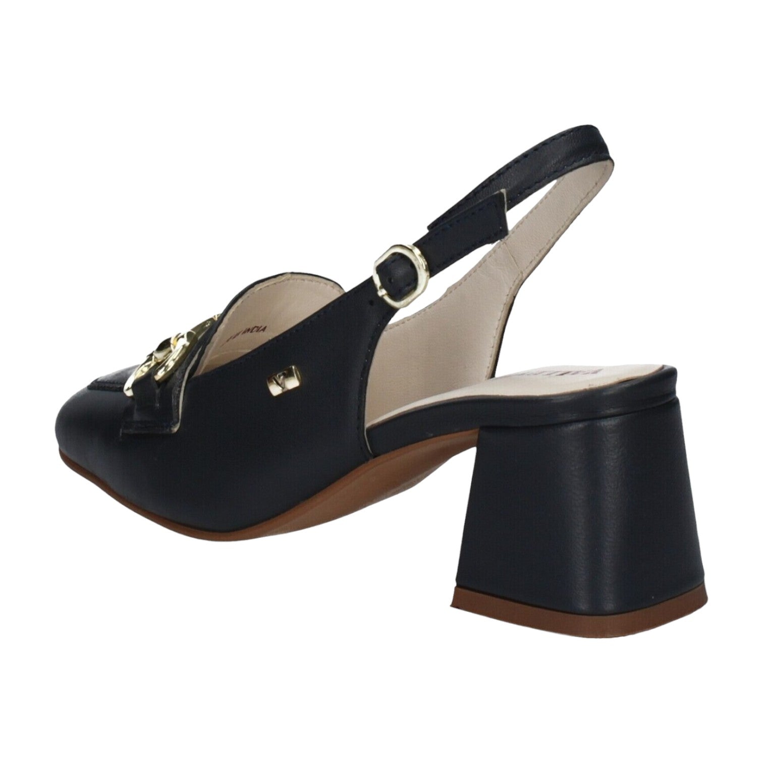 Il Décolleté firmato Valleverde, realizzato in pelle è caratterizzato da punta squadrata impreziosita da un morsetto dorato metallico e da tacco largo alto 6cm con finitura liscia la rende comoda e formale, inoltre dispone di chiusura con cinturino alla caviglia regolabile con fibbietta in metallo.