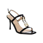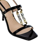 Il Sandalo firmato Albano, realizzato in vernice è caratterizzato da una punta quadra con accessorio placcato in oro con pietre, e da un tacco laccato nero a stiletto alto 9cm, presenta un design elegante, questo sandalo si conferma un must have nel guardaroba femminile.