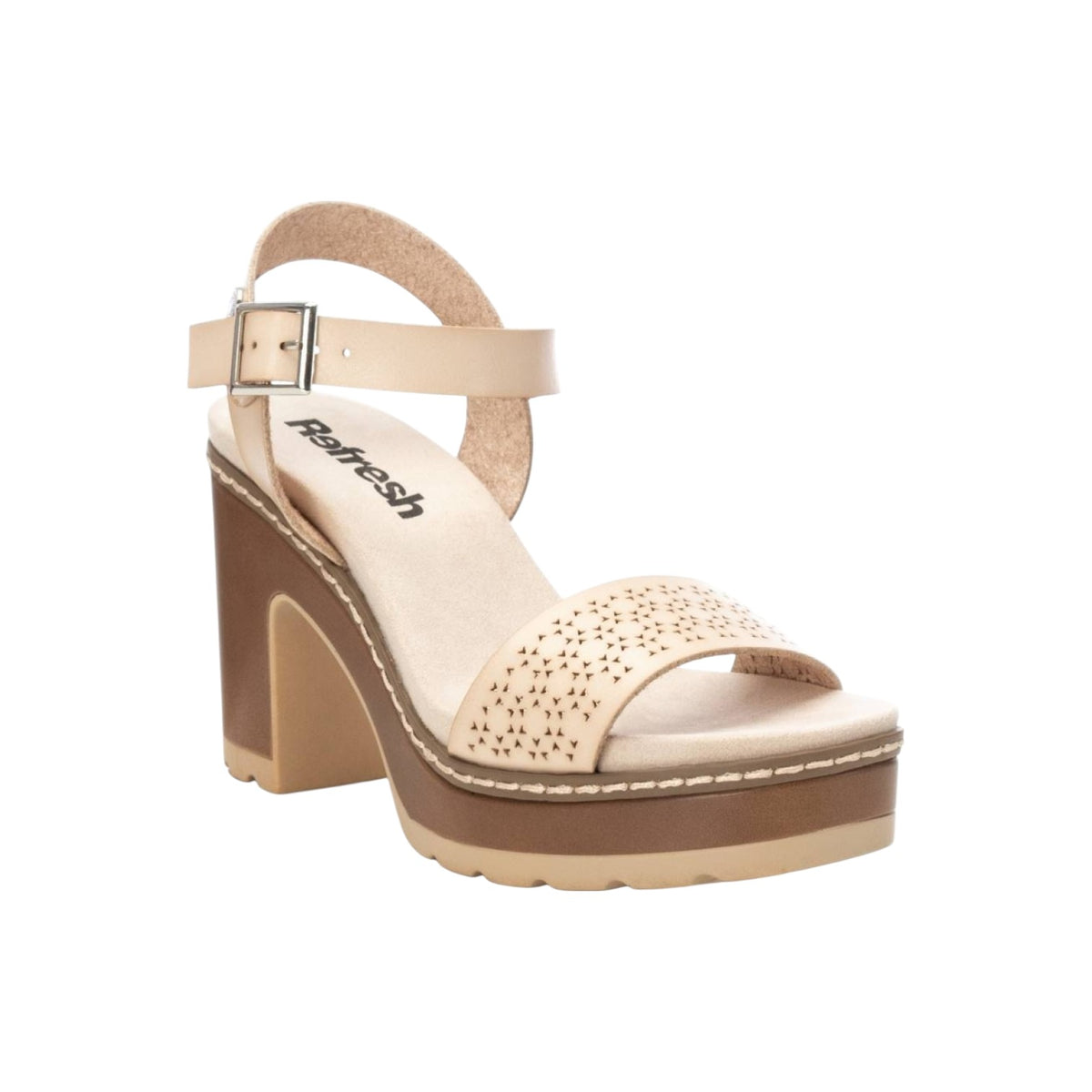 Il Sandalo firmato Refresh, realizzato in ecopelle qui proposto nella variante ghiaccio è caratterizzato da trama traforata sulla fascia frontale e da un comodo plantare ammortizzante, inoltre dispone di tacco di 9cm accompagnato da plateau.