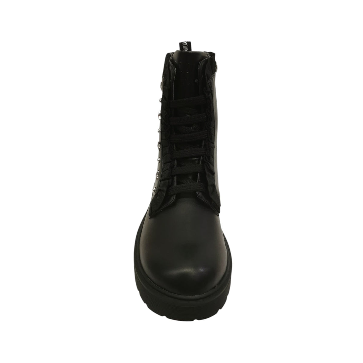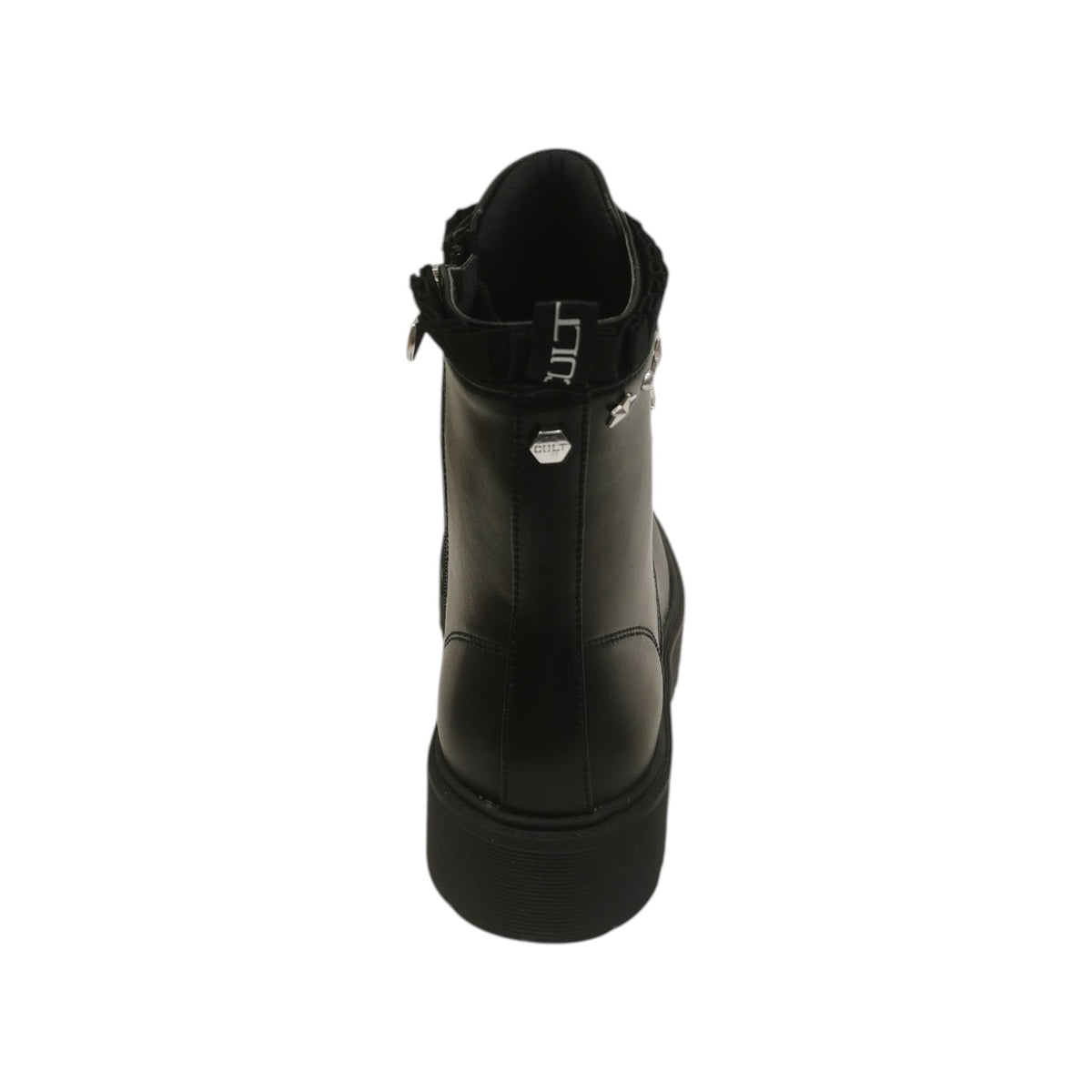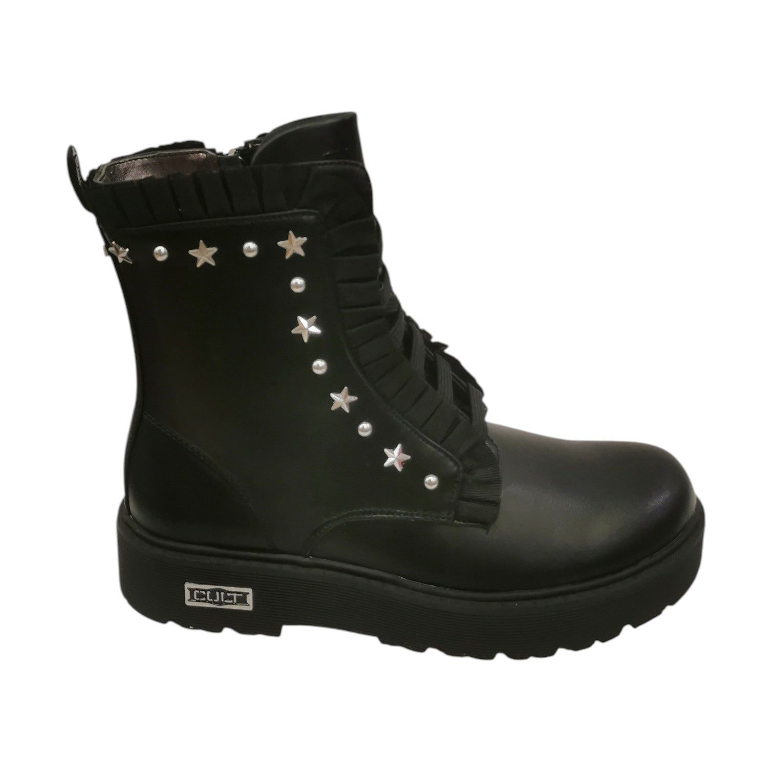 L'Anfibio firmato Cult, realizzato in ecopelle qui proposto nella variante nera è caratterizzato da borchiette laterali e da rouches, l'interno è foderato in tessuto con plantare in pelle, mentre lo stile moderno li rende perfetti per ogni occasione, unendo praticità ed eleganza