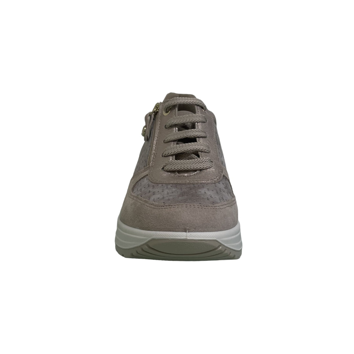 La Sneakers firmata Enval Soft, realizzata in camoscio e pelle effetto perlato brillantinato, presenta una comoda chiusura con lacci e zip laterale, e un plantare in pelle estraibile memory foam. La zeppa interna è molto leggera e regala centimetri alla figura senza affaticare la camminata.