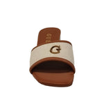 La Ciabatta firmata Guess, realizzata in ecopelle è caratterizzata da una fascia larga frontale con fantasia intrecciata beige con dettaglio scritta logo "G" in metalleria oro pallido, accompagnata da un tacco largo effetto legno alto 6cm.
