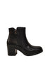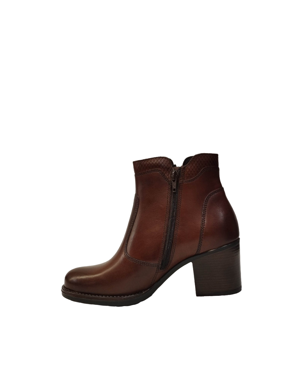 Lo Stivaletto firmato Valleverde, realizzato in pelle con dettagli snake tono su tono; un modello dalle linee casual caratterizzato da zip laterale con tacco largo alto 6cm e suola antiscivolo con fodera interna in tessuto.